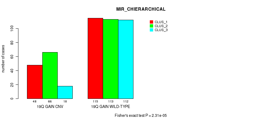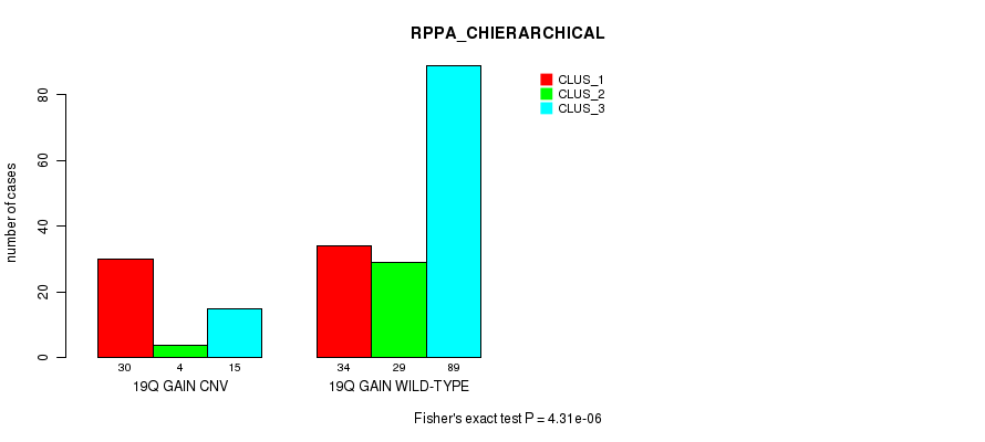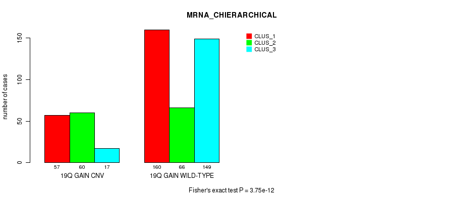 19q gain cnv correlated to 'MRNA_CNMF', 'MRNA_CHIERARCHICAL', 'MIR_CHIERARCHICAL', 'CN_CNMF', and 'RPPA_CHIERARCHICAL'.