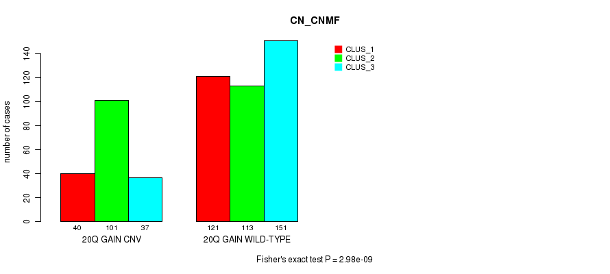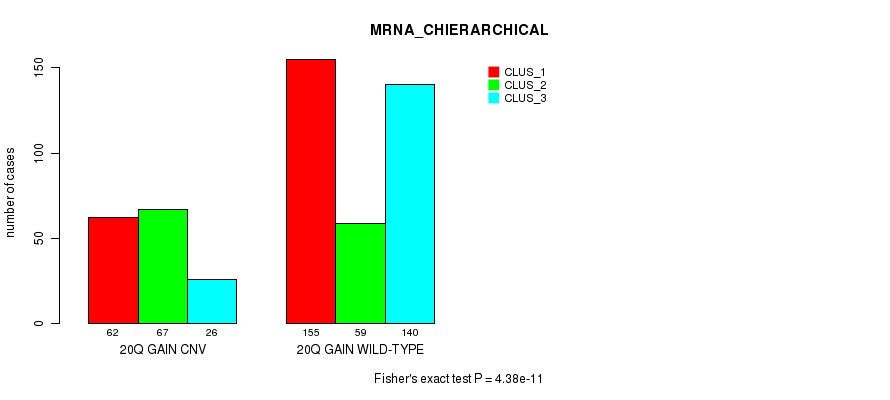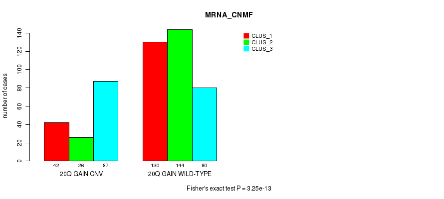 20q gain cnv correlated to 'MRNA_CNMF', 'MRNA_CHIERARCHICAL', 'MIR_CHIERARCHICAL', and 'CN_CNMF'.