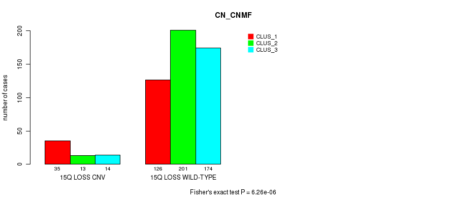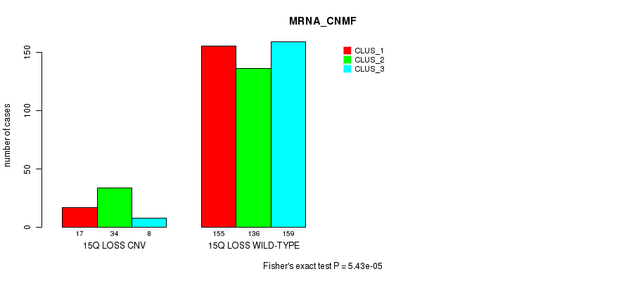 15q loss cnv correlated to 'MRNA_CNMF', 'MRNA_CHIERARCHICAL', 'MIR_CHIERARCHICAL', 'CN_CNMF', and 'METHLYATION_CNMF'.
