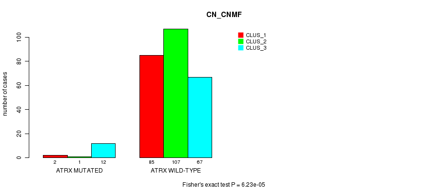 ATRX mutation correlated to 'MRNA_CNMF', 'MRNA_CHIERARCHICAL', 'MIR_CHIERARCHICAL', and 'CN_CNMF'.