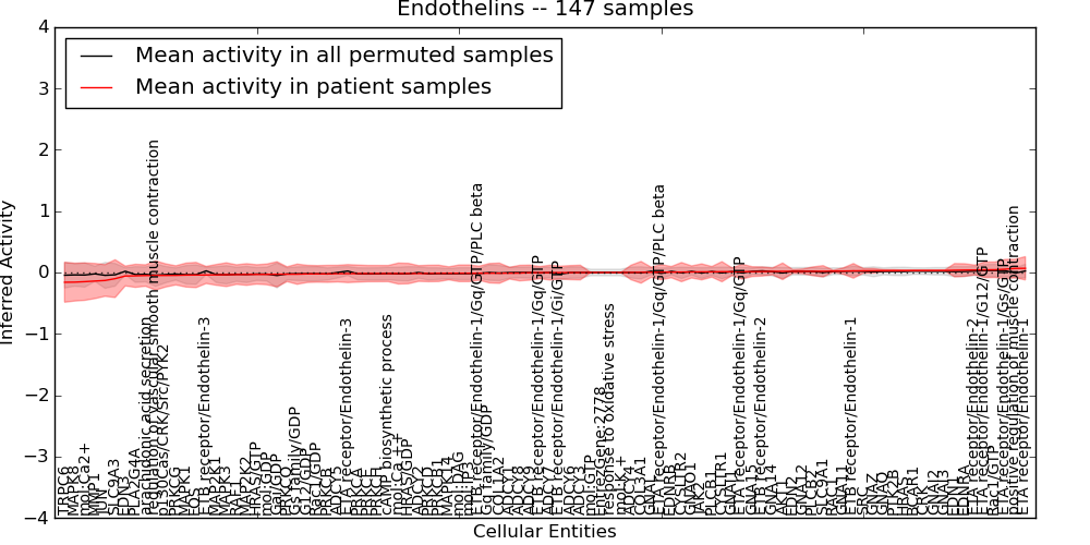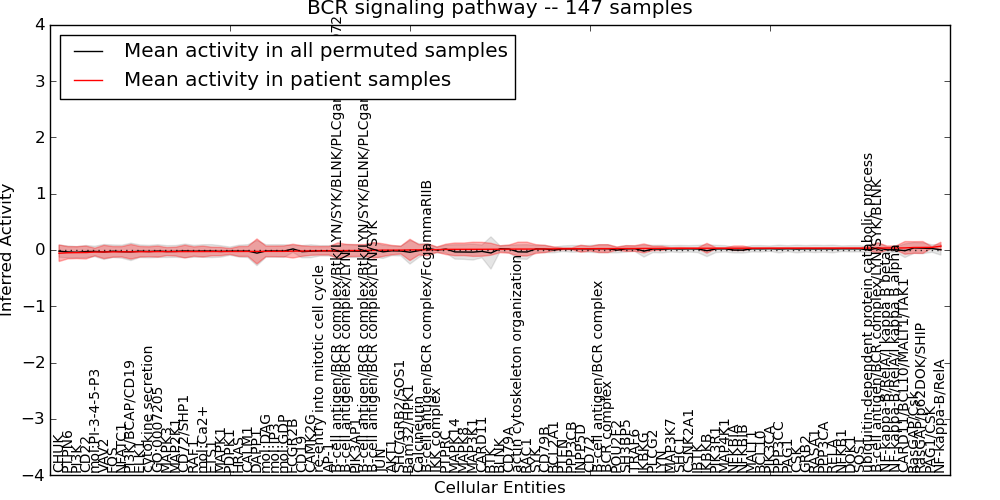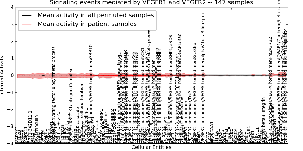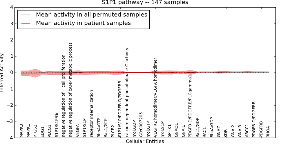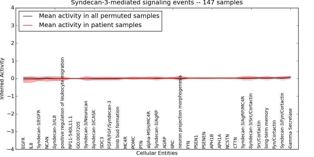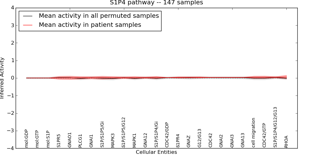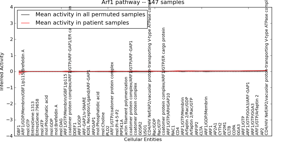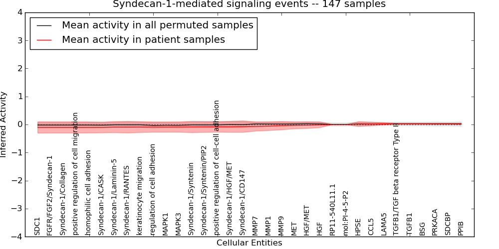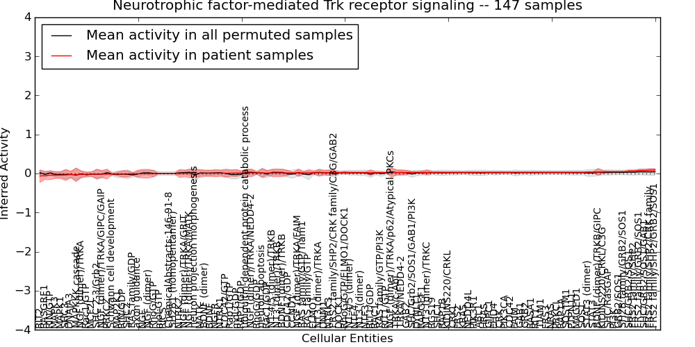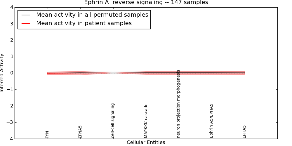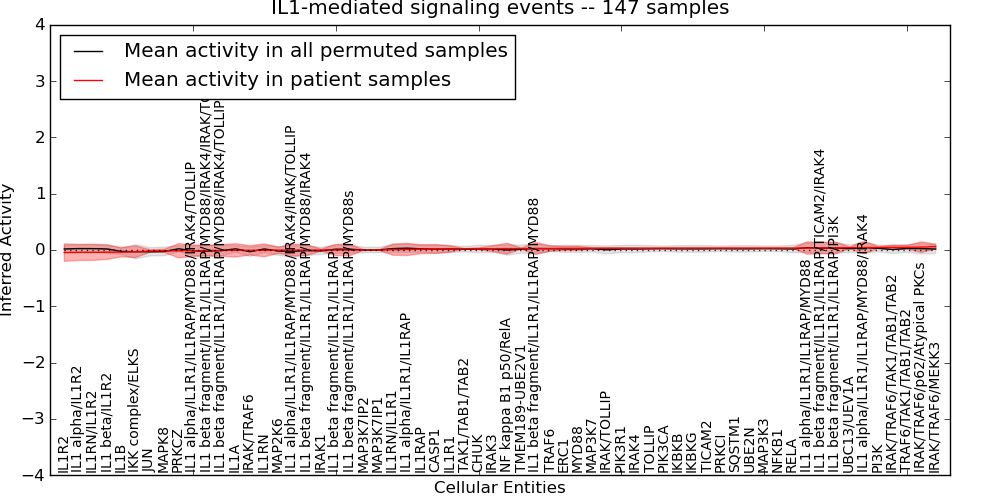 Figure S131. Get High-res Image This plot shows pathway concept perturbations across all samples against a permutation model. The concepts along the x-axis are sorted by lowest to highest mean activity for the real patient samples. Mean inferred activities are plotted along the y-axis as a colored band showing the average level and one standard deviation range. Real samples are shown in red and permuted samples in black.