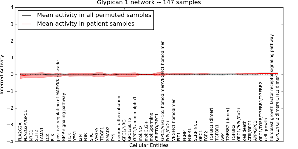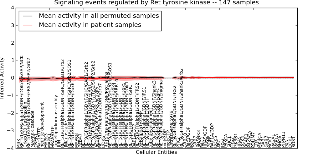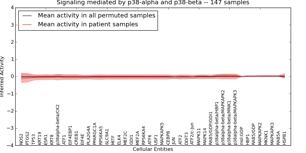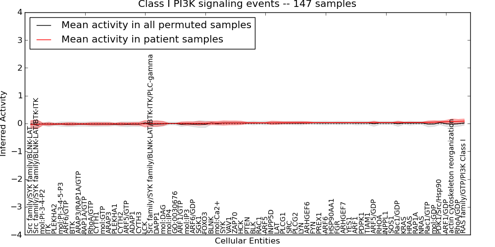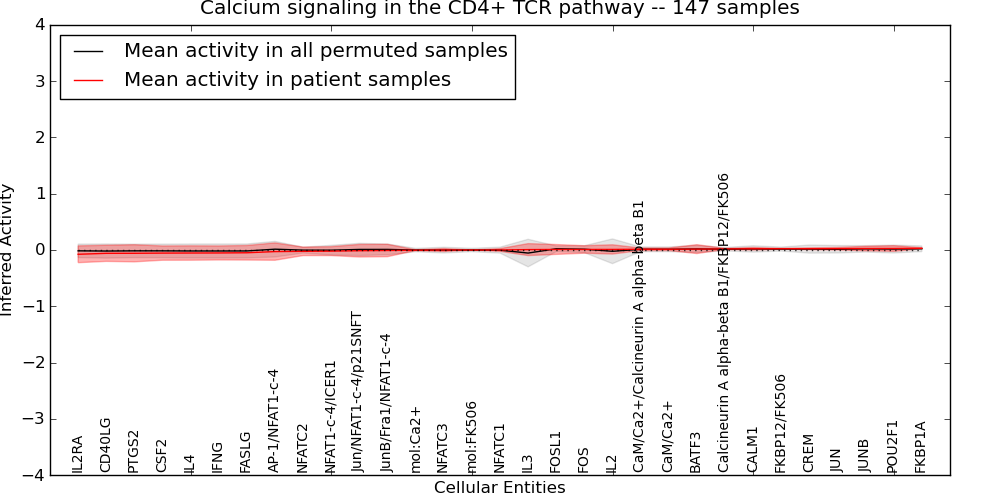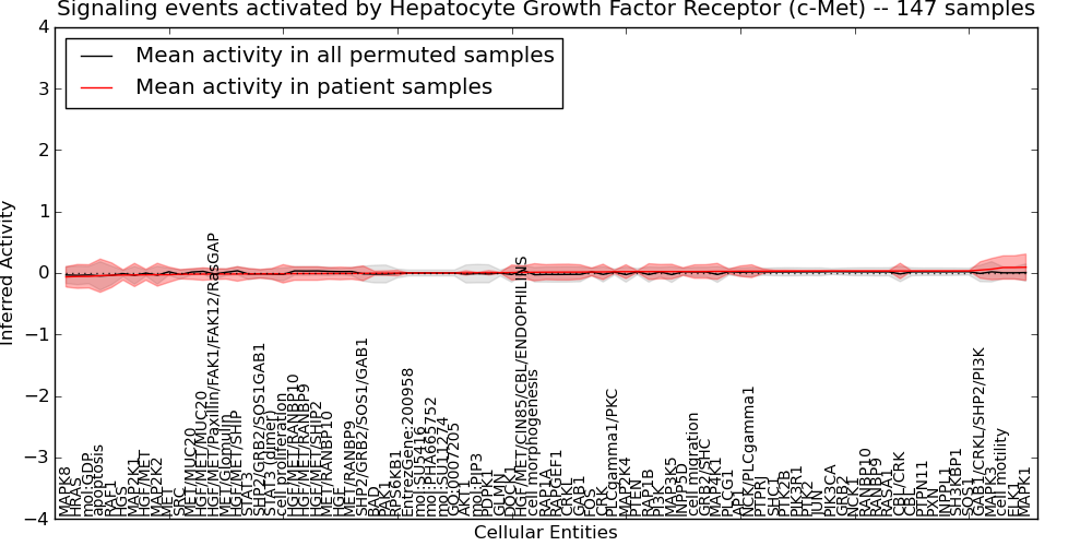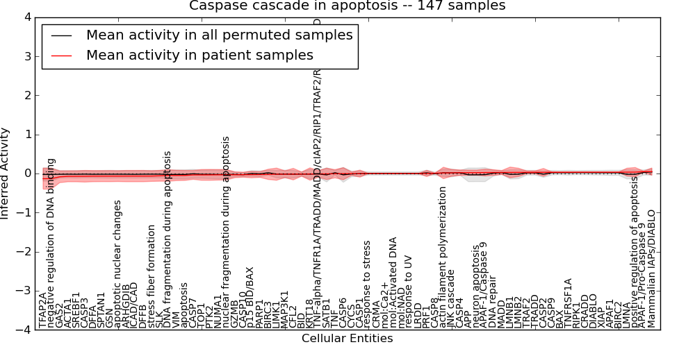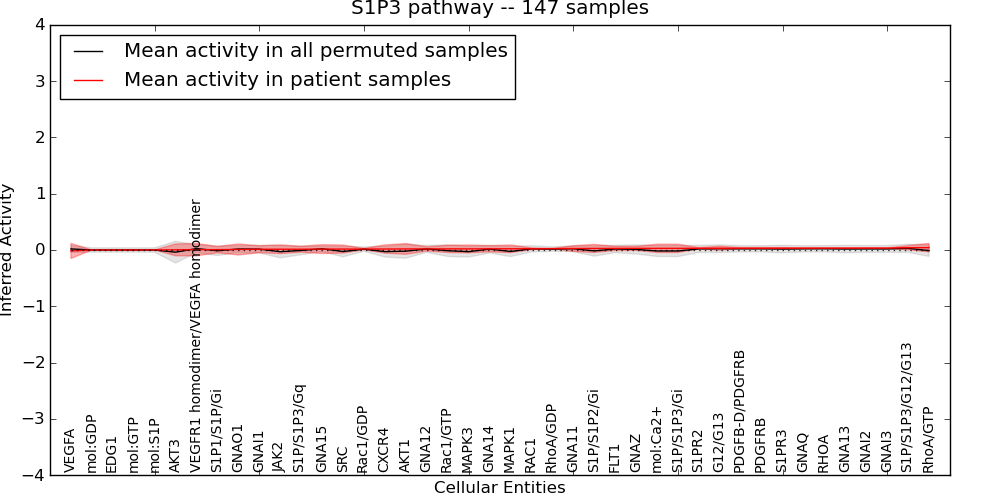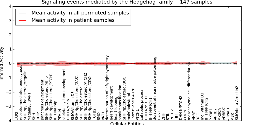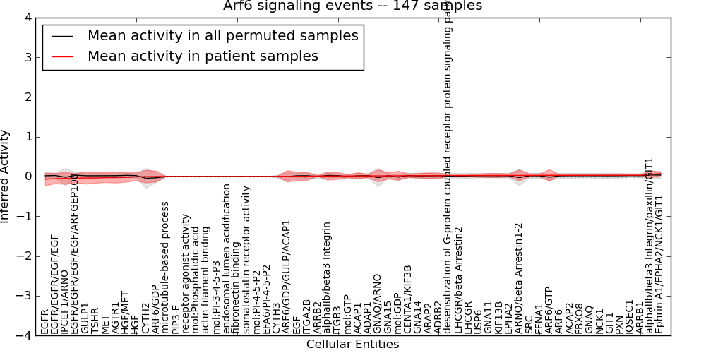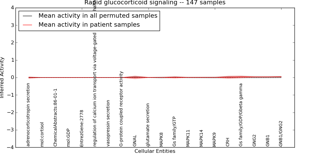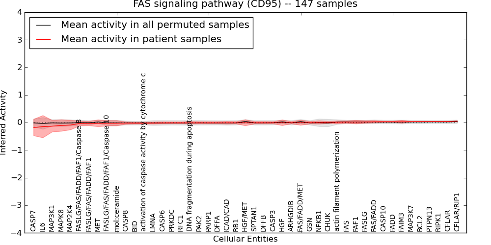 Figure S131. Get High-res Image This plot shows pathway concept perturbations across all samples against a permutation model. The concepts along the x-axis are sorted by lowest to highest mean activity for the real patient samples. Mean inferred activities are plotted along the y-axis as a colored band showing the average level and one standard deviation range. Real samples are shown in red and permuted samples in black.