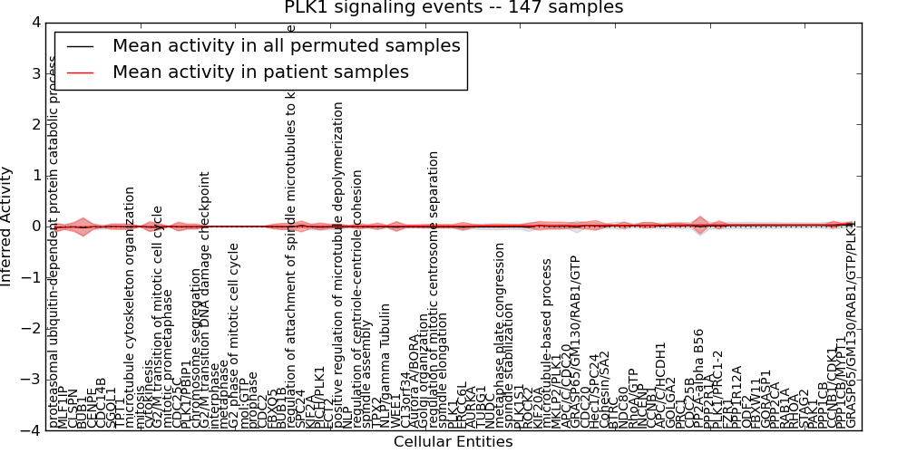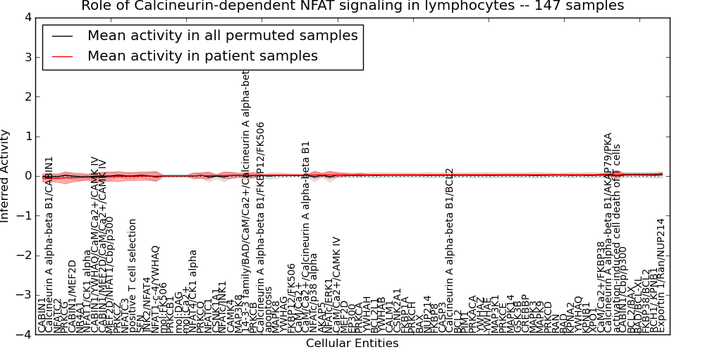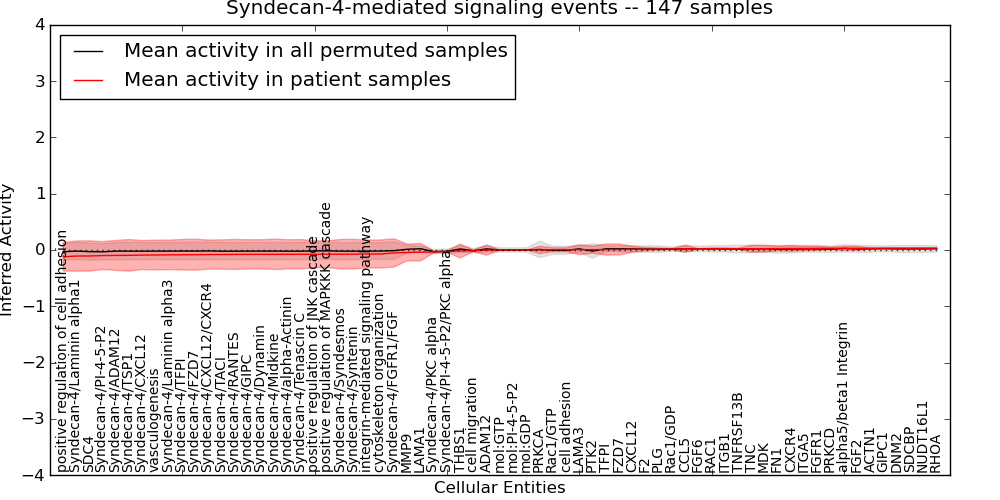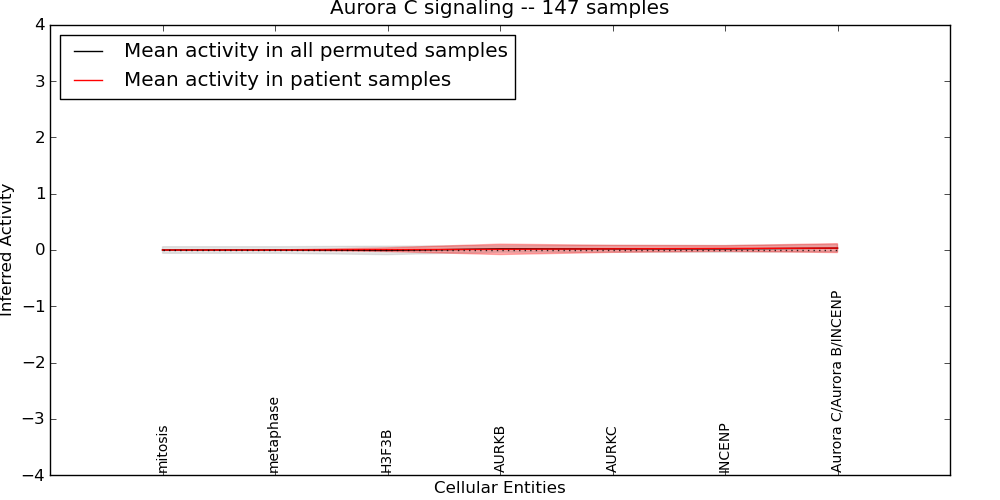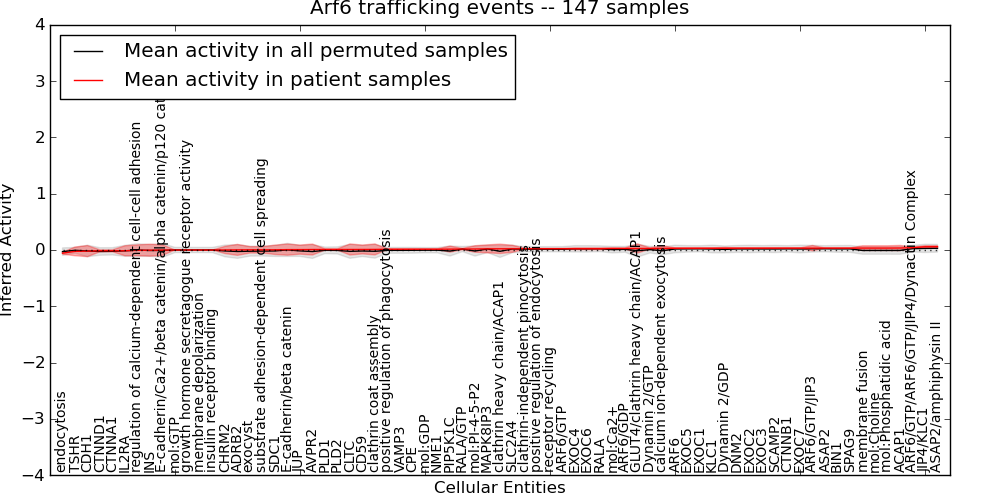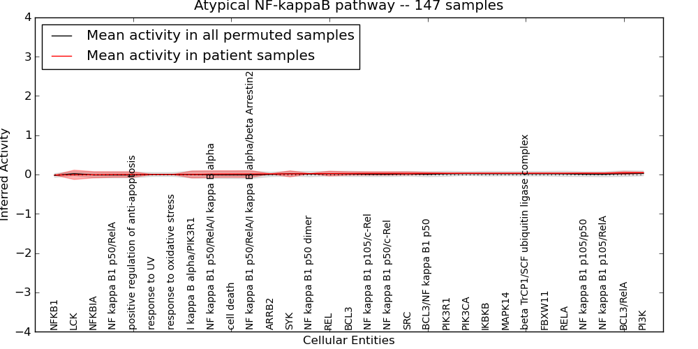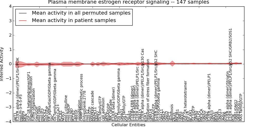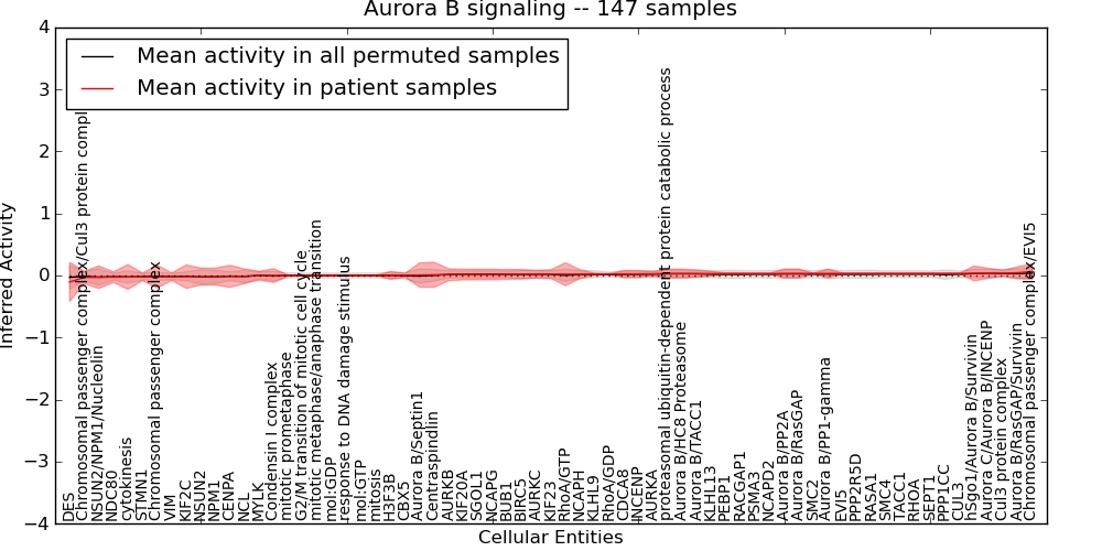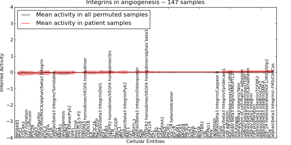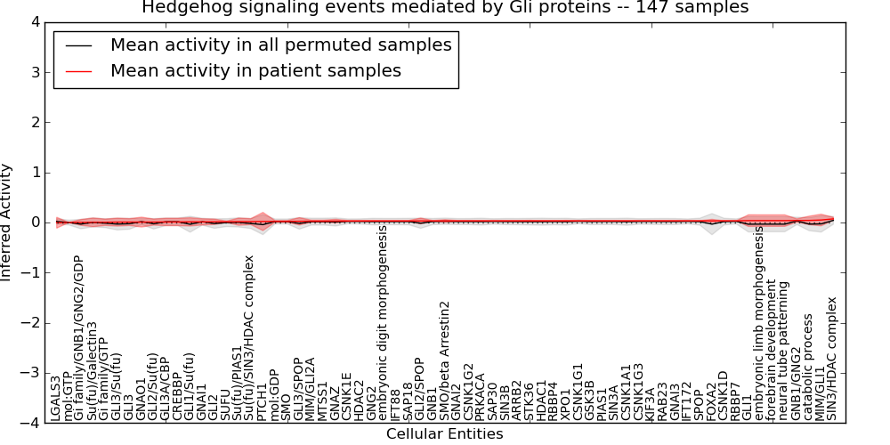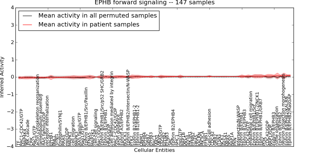 Figure S131. Get High-res Image This plot shows pathway concept perturbations across all samples against a permutation model. The concepts along the x-axis are sorted by lowest to highest mean activity for the real patient samples. Mean inferred activities are plotted along the y-axis as a colored band showing the average level and one standard deviation range. Real samples are shown in red and permuted samples in black.