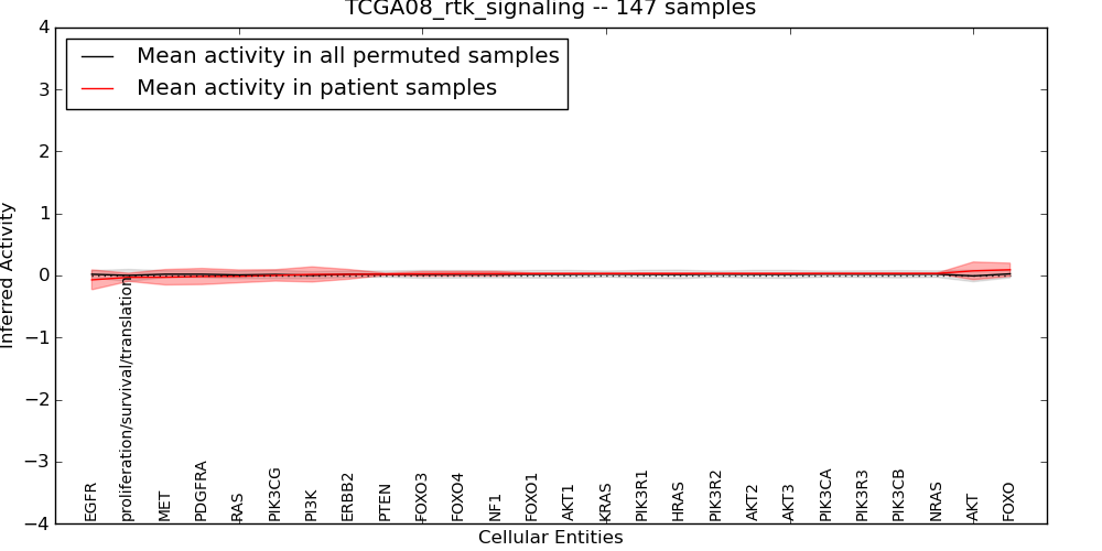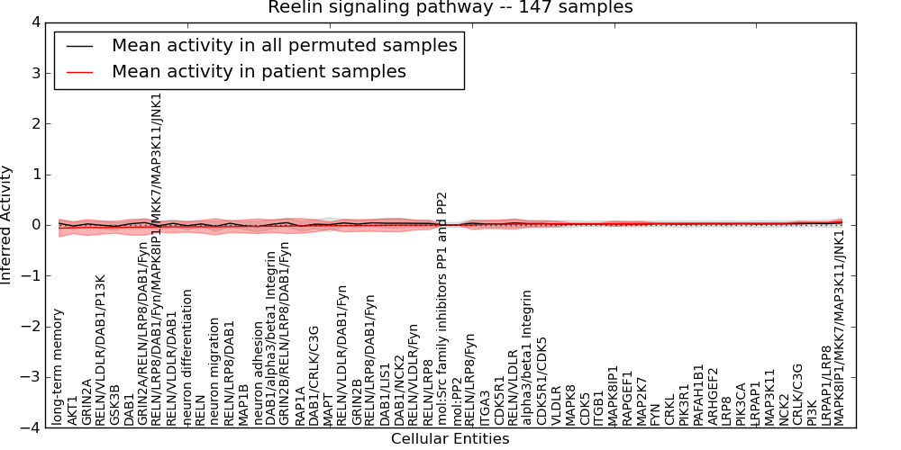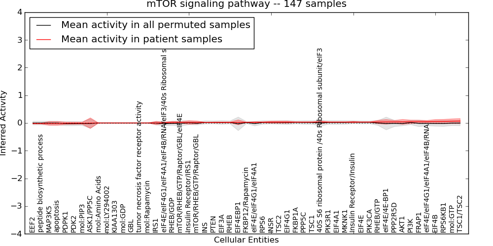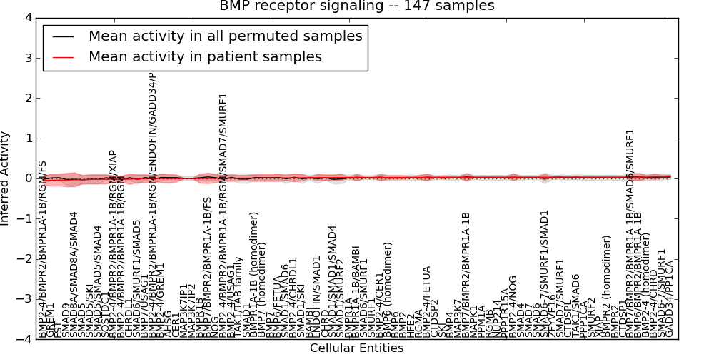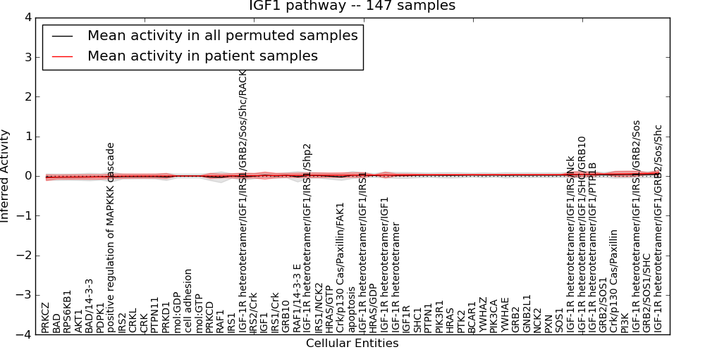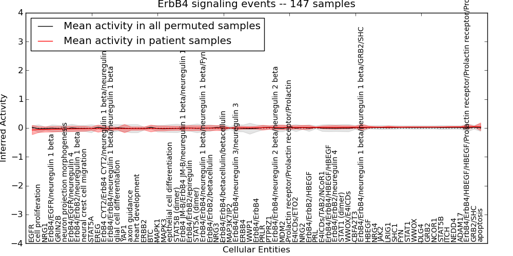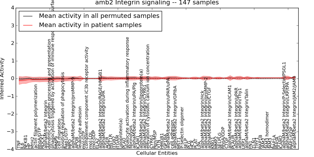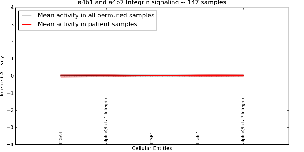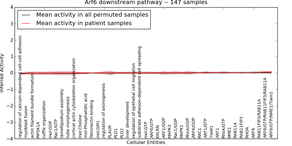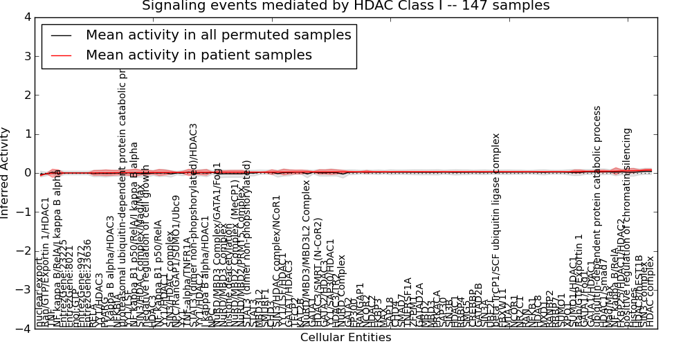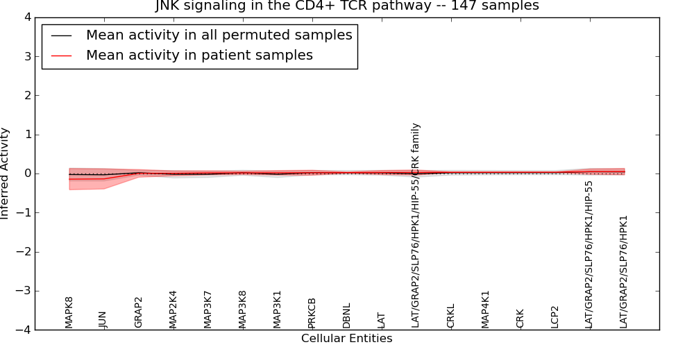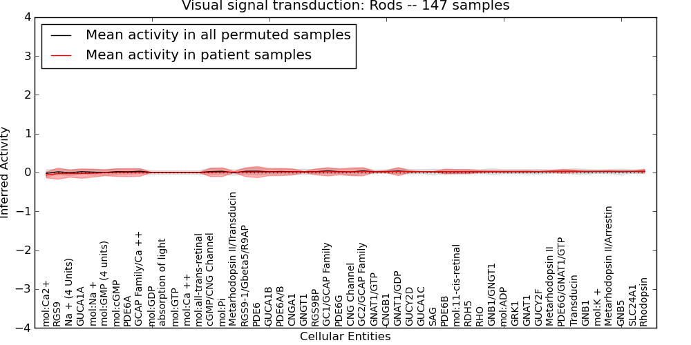 Figure S131. Get High-res Image This plot shows pathway concept perturbations across all samples against a permutation model. The concepts along the x-axis are sorted by lowest to highest mean activity for the real patient samples. Mean inferred activities are plotted along the y-axis as a colored band showing the average level and one standard deviation range. Real samples are shown in red and permuted samples in black.