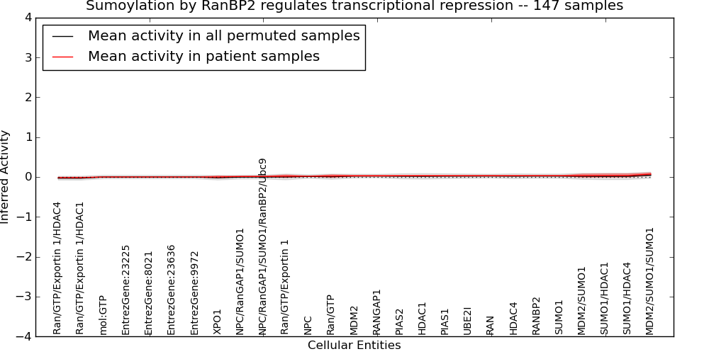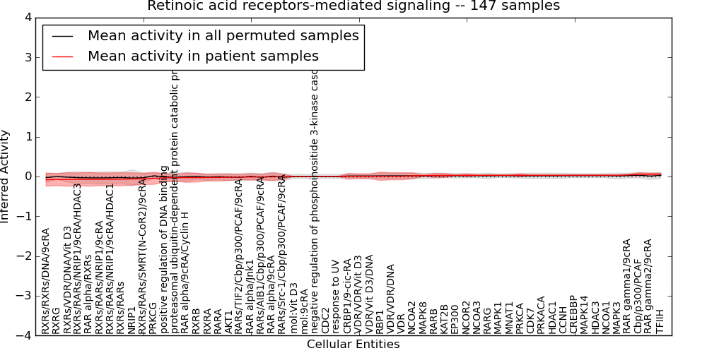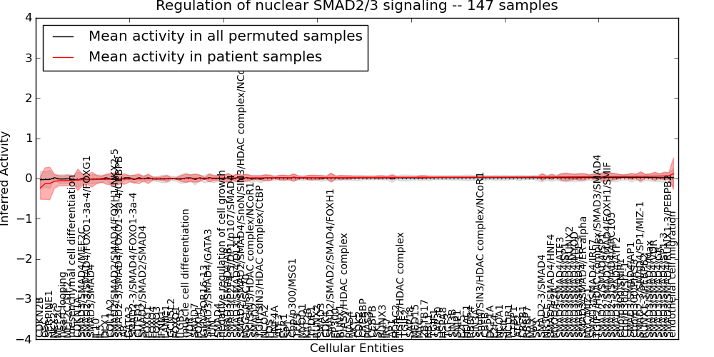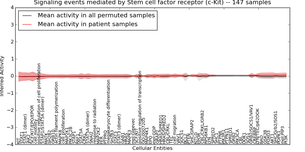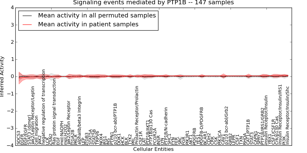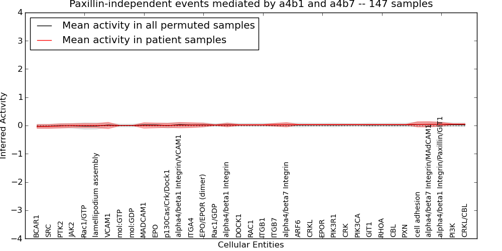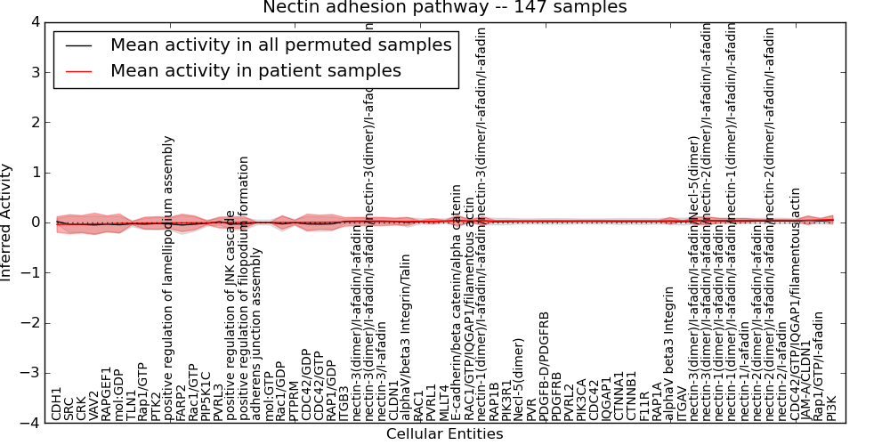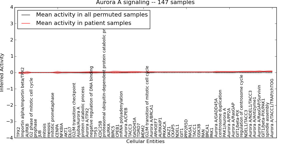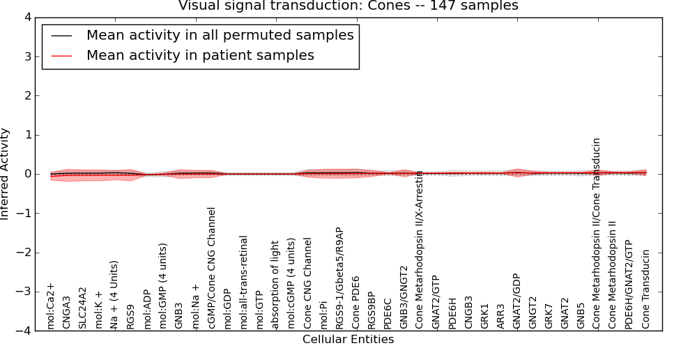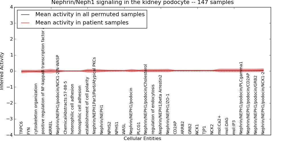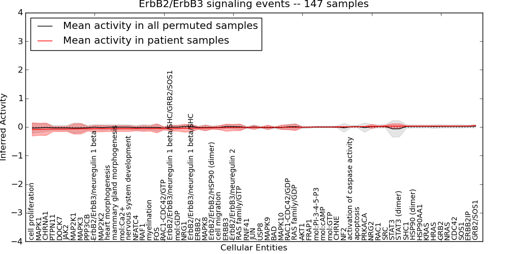 Figure S131. Get High-res Image This plot shows pathway concept perturbations across all samples against a permutation model. The concepts along the x-axis are sorted by lowest to highest mean activity for the real patient samples. Mean inferred activities are plotted along the y-axis as a colored band showing the average level and one standard deviation range. Real samples are shown in red and permuted samples in black.