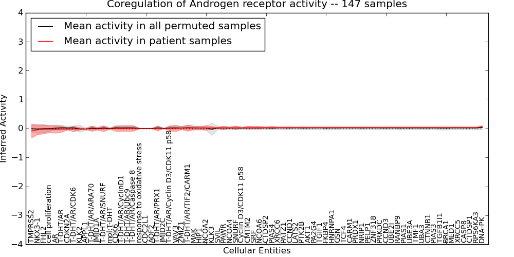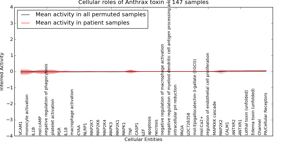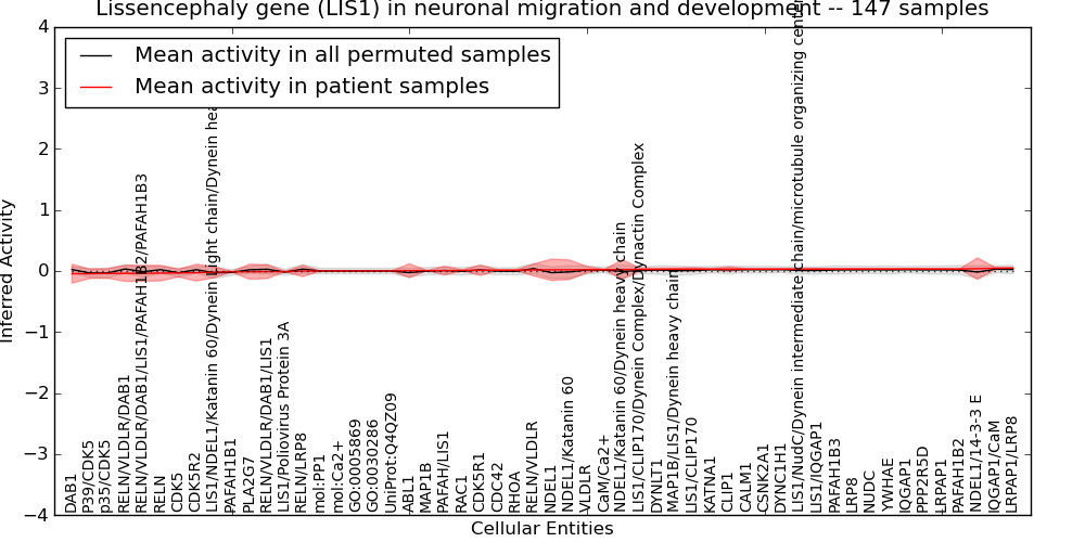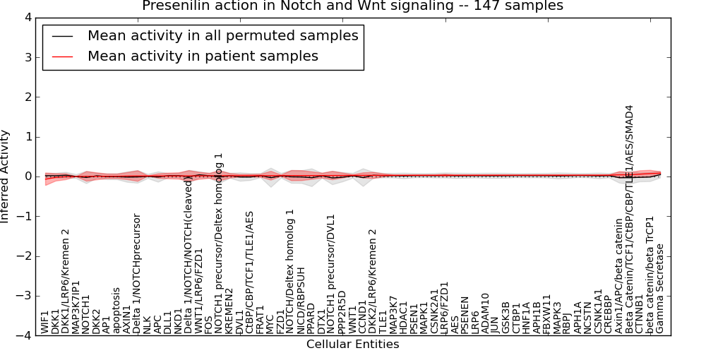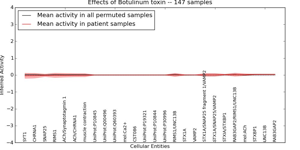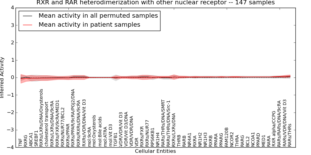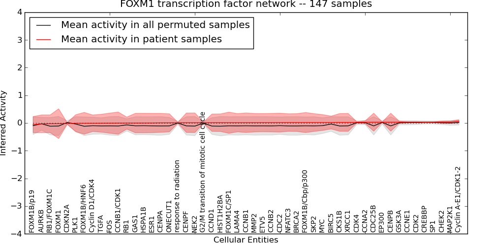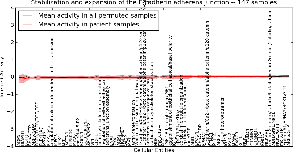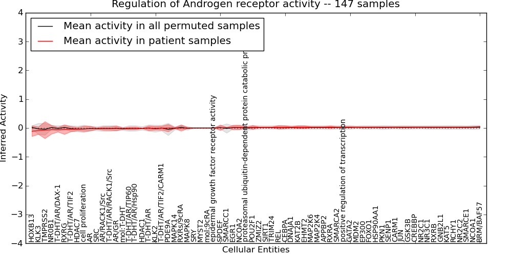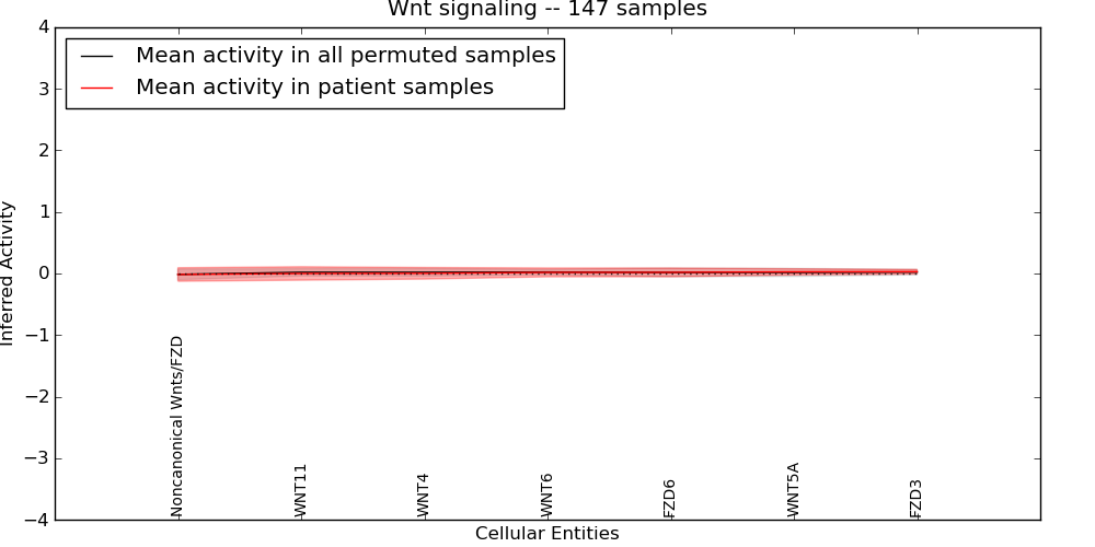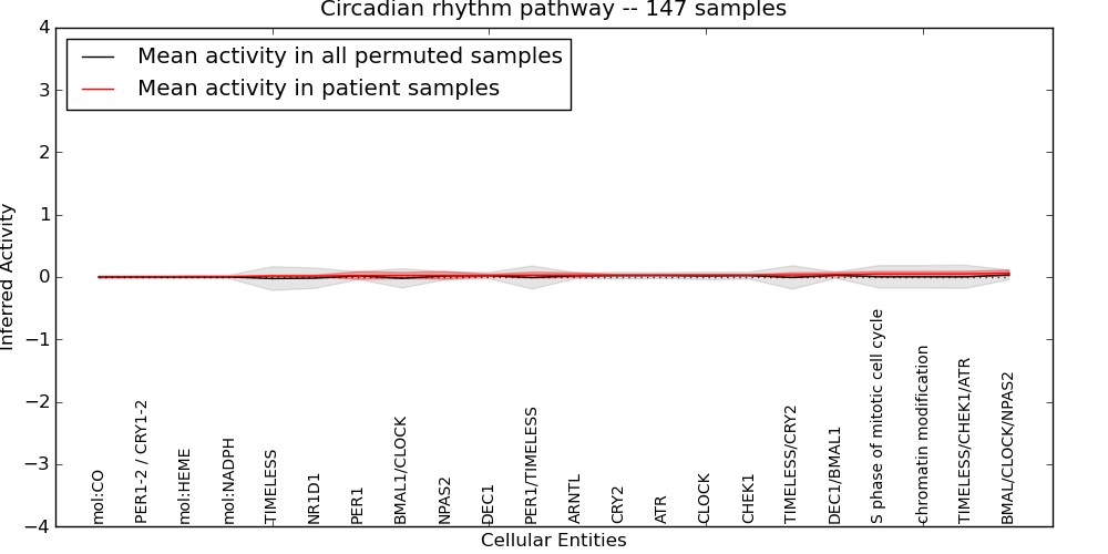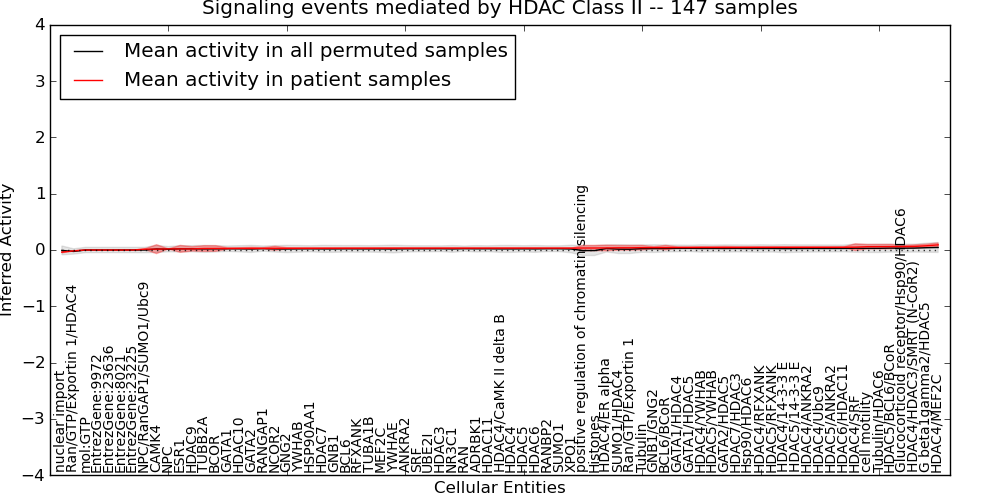 Figure S131. Get High-res Image This plot shows pathway concept perturbations across all samples against a permutation model. The concepts along the x-axis are sorted by lowest to highest mean activity for the real patient samples. Mean inferred activities are plotted along the y-axis as a colored band showing the average level and one standard deviation range. Real samples are shown in red and permuted samples in black.