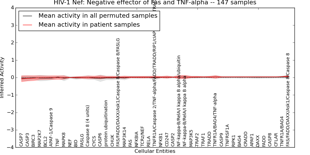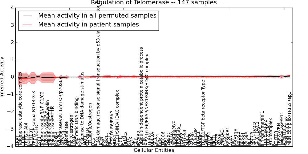 Figure S130. Get High-res Image This plot shows pathway concept perturbations across all samples against a permutation model. The concepts along the x-axis are sorted by lowest to highest mean activity for the real patient samples. Mean inferred activities are plotted along the y-axis as a colored band showing the average level and one standard deviation range. Real samples are shown in red and permuted samples in black.