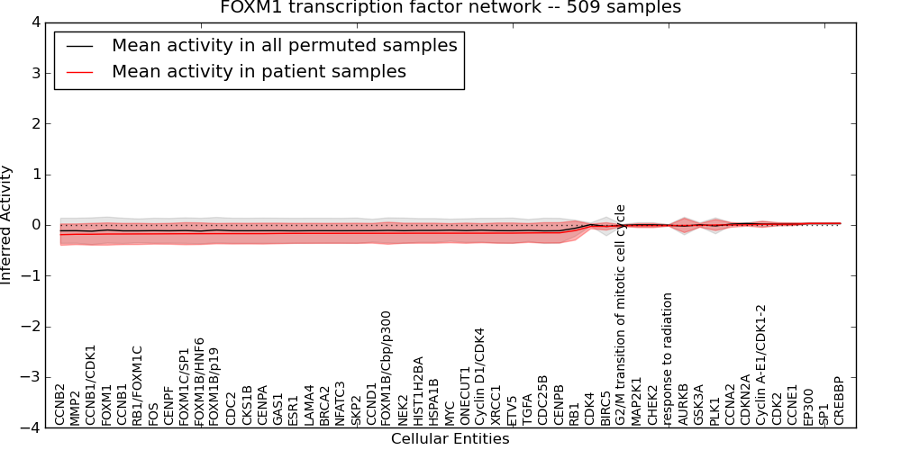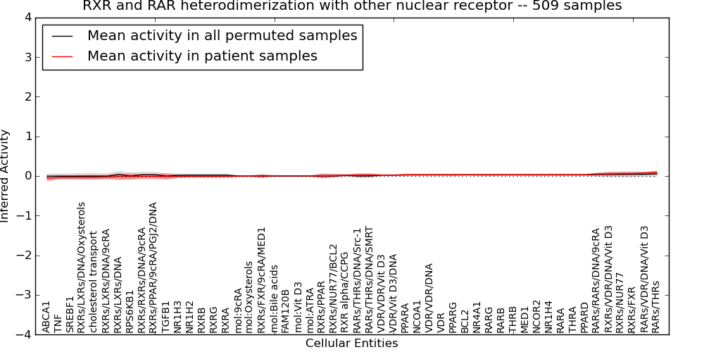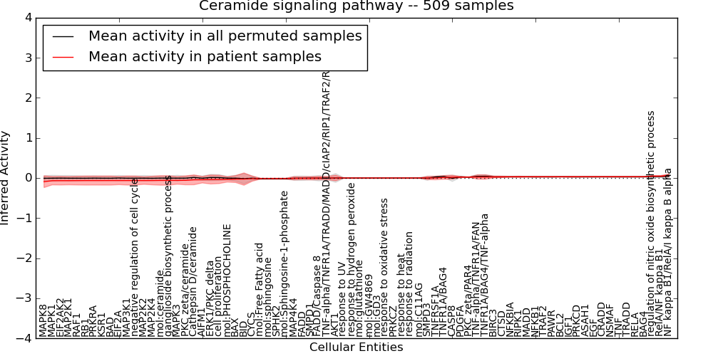 Figure S128. Get High-res Image This plot shows pathway concept perturbations across all samples against a permutation model. The concepts along the x-axis are sorted by lowest to highest mean activity for the real patient samples. Mean inferred activities are plotted along the y-axis as a colored band showing the average level and one standard deviation range. Real samples are shown in red and permuted samples in black.