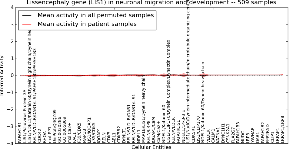Figure S131. Get High-res Image This plot shows pathway concept perturbations across all samples against a permutation model. The concepts along the x-axis are sorted by lowest to highest mean activity for the real patient samples. Mean inferred activities are plotted along the y-axis as a colored band showing the average level and one standard deviation range. Real samples are shown in red and permuted samples in black.