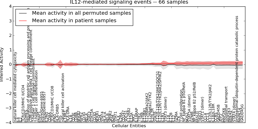 Figure S131. Get High-res Image This plot shows pathway concept perturbations across all samples against a permutation model. The concepts along the x-axis are sorted by lowest to highest mean activity for the real patient samples. Mean inferred activities are plotted along the y-axis as a colored band showing the average level and one standard deviation range. Real samples are shown in red and permuted samples in black.