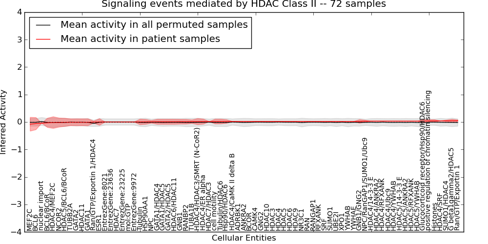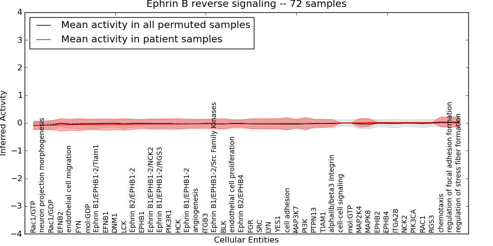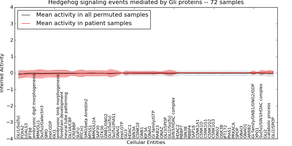 Figure S131. Get High-res Image This plot shows pathway concept perturbations across all samples against a permutation model. The concepts along the x-axis are sorted by lowest to highest mean activity for the real patient samples. Mean inferred activities are plotted along the y-axis as a colored band showing the average level and one standard deviation range. Real samples are shown in red and permuted samples in black.