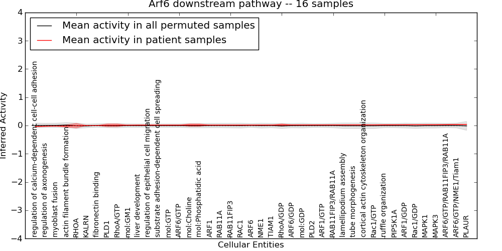 Figure S131. Get High-res Image This plot shows pathway concept perturbations across all samples against a permutation model. The concepts along the x-axis are sorted by lowest to highest mean activity for the real patient samples. Mean inferred activities are plotted along the y-axis as a colored band showing the average level and one standard deviation range. Real samples are shown in red and permuted samples in black.