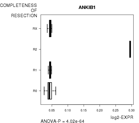 Figure S9. Get High-res Image As an example, this figure shows the association of ANKIB1 to 'COMPLETENESS.OF.RESECTION'. P value = 4.02e-64 with ANOVA analysis.
