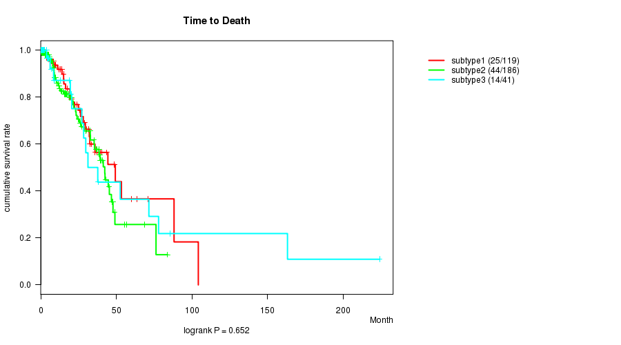 Consensus hierarchical clustering analysis on array-based mRNA expression data identified 3 subtypes that do not correlate to any clinical features.