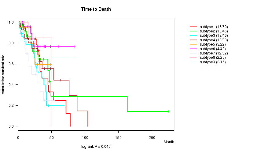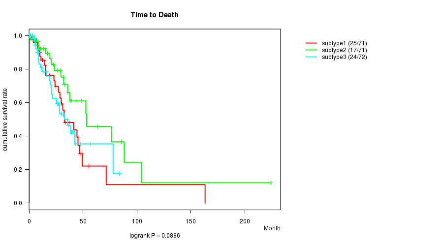 Table S135. Clustering Approach #10: 'MIRSEQ CHIERARCHICAL' versus Clinical Feature #1: 'Time to Death'