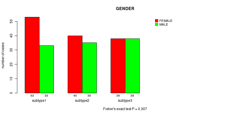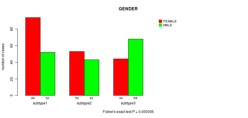 Table S137. Clustering Approach #10: 'MIRSEQ CHIERARCHICAL' versus Clinical Feature #3: 'GENDER'