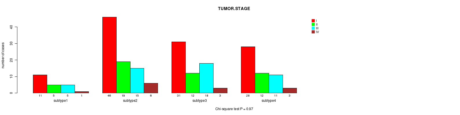 Table S143. Clustering Approach #10: 'MIRSEQ CHIERARCHICAL' versus Clinical Feature #9: 'TUMOR.STAGE'