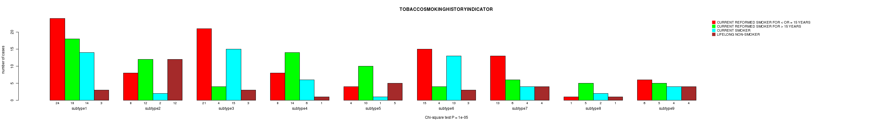 CNMF clustering analysis on sequencing-based mRNA expression data identified 9 subtypes that correlate to 'AGE', 'GENDER', 'HISTOLOGICAL.TYPE', and 'TOBACCOSMOKINGHISTORYINDICATOR'.