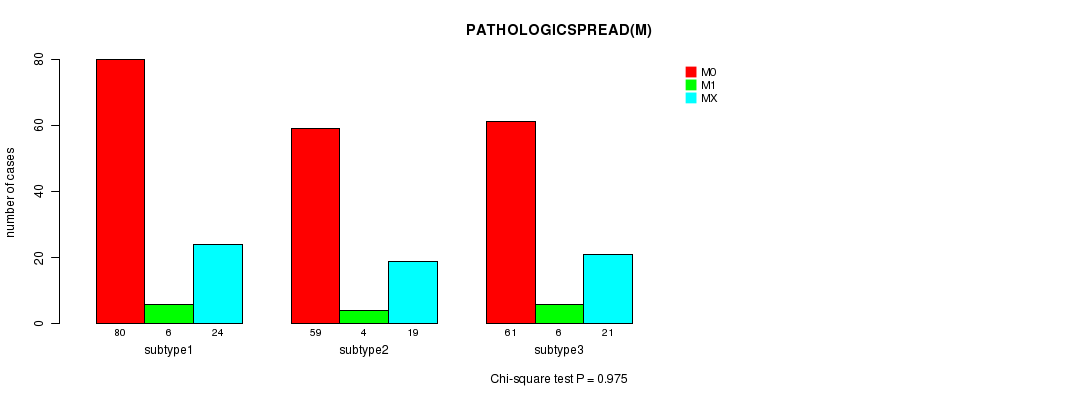 Figure S132. Get High-res Image Clustering Approach #10: 'MIRSEQ CHIERARCHICAL' versus Clinical Feature #8: 'PATHOLOGICSPREAD(M)'