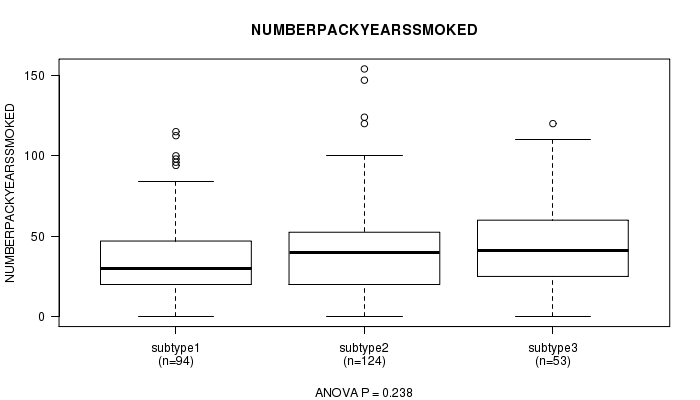 Figure S135. Get High-res Image Clustering Approach #10: 'MIRSEQ CHIERARCHICAL' versus Clinical Feature #11: 'NUMBERPACKYEARSSMOKED'