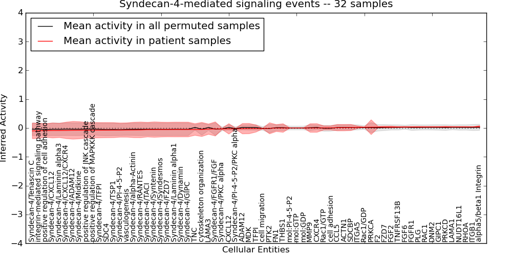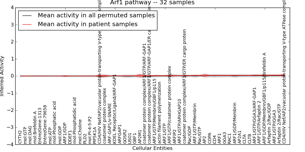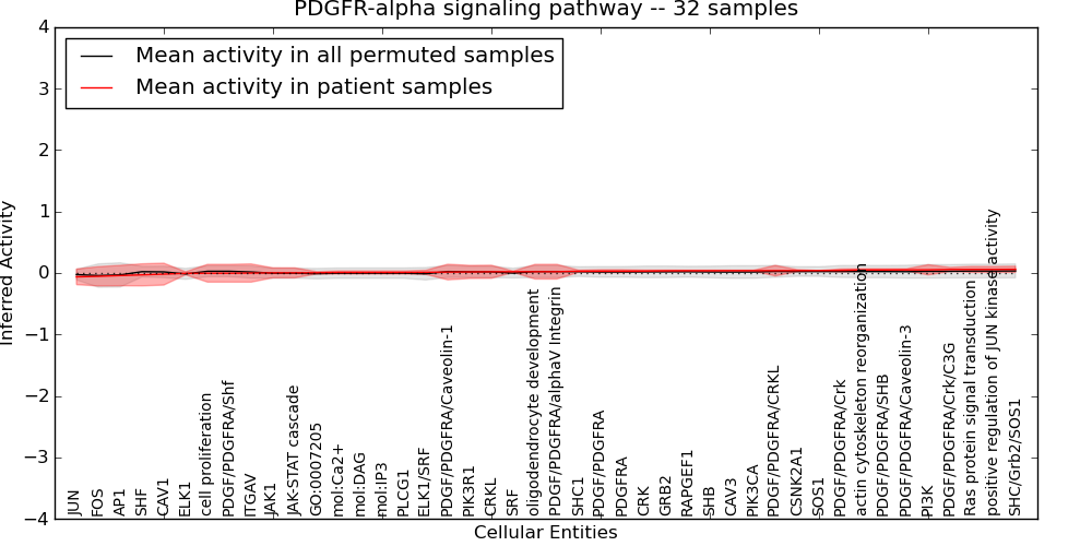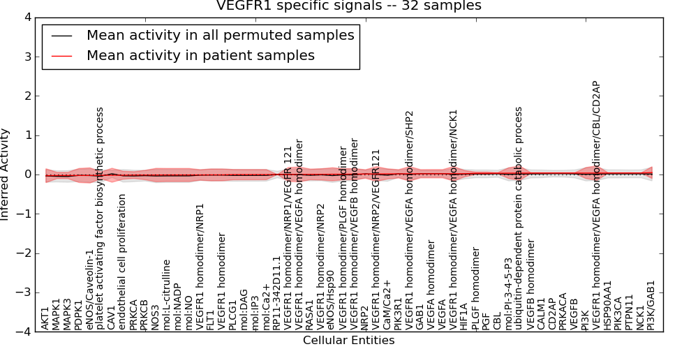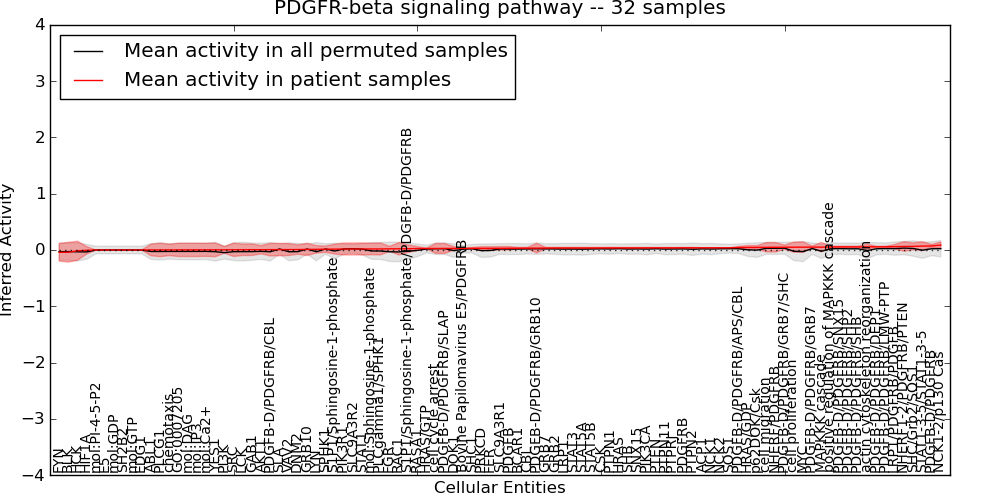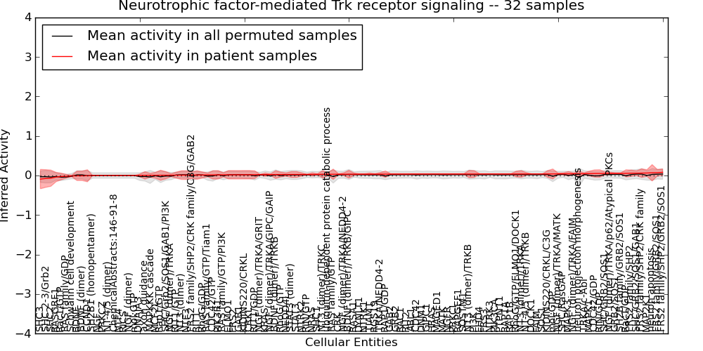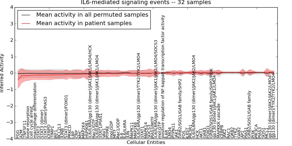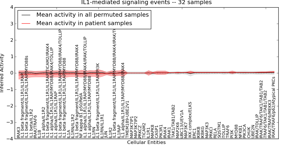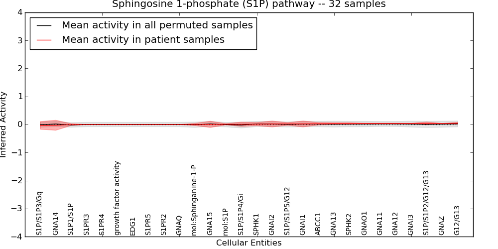 Figure S131. Get High-res Image This plot shows pathway concept perturbations across all samples against a permutation model. The concepts along the x-axis are sorted by lowest to highest mean activity for the real patient samples. Mean inferred activities are plotted along the y-axis as a colored band showing the average level and one standard deviation range. Real samples are shown in red and permuted samples in black.