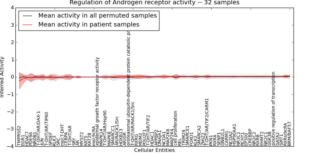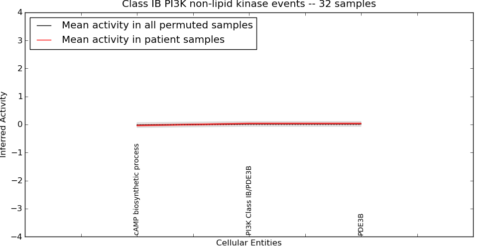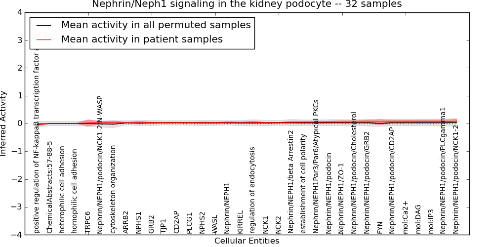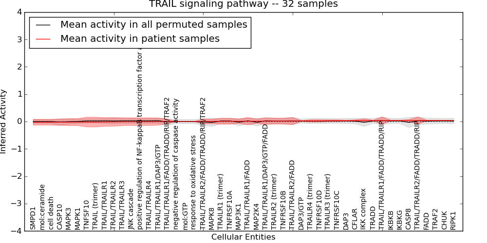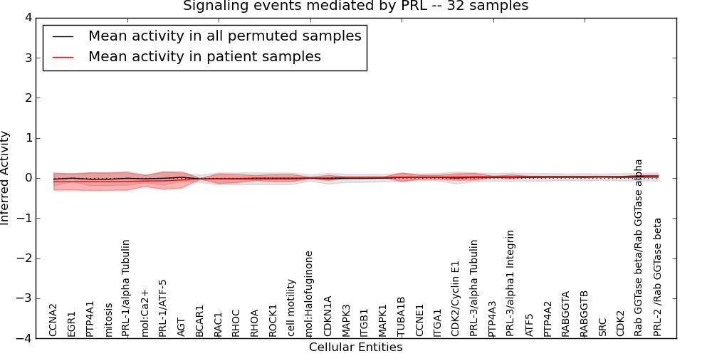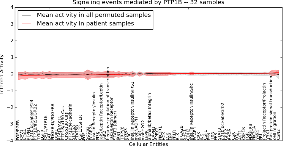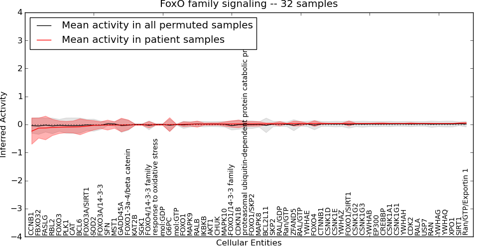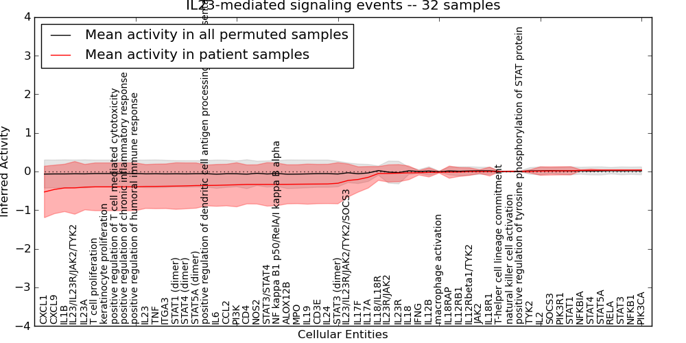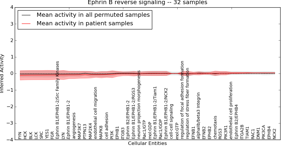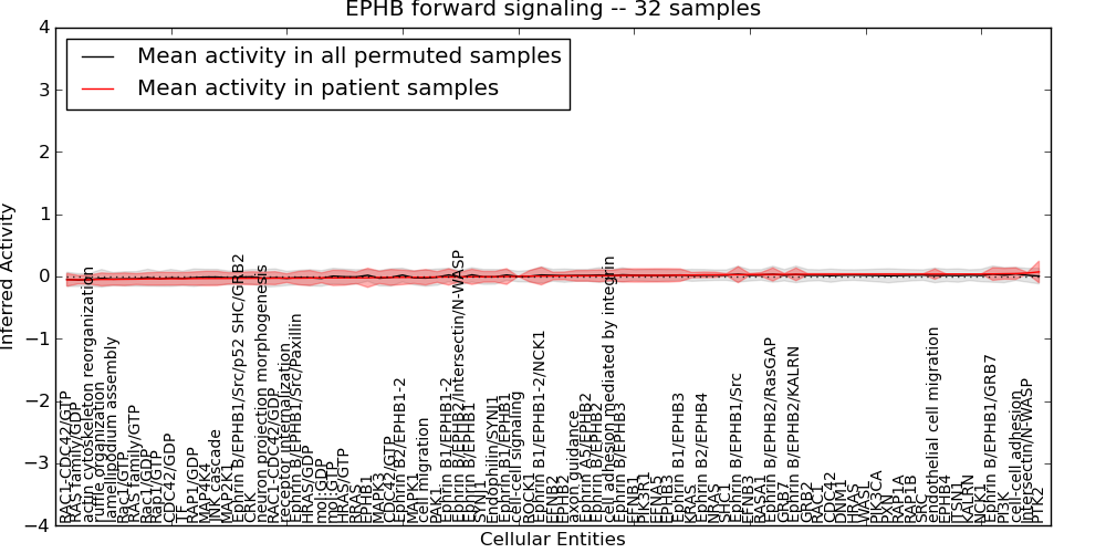 Figure S131. Get High-res Image This plot shows pathway concept perturbations across all samples against a permutation model. The concepts along the x-axis are sorted by lowest to highest mean activity for the real patient samples. Mean inferred activities are plotted along the y-axis as a colored band showing the average level and one standard deviation range. Real samples are shown in red and permuted samples in black.
