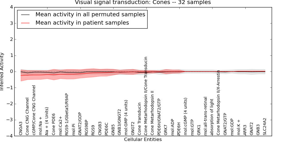 Figure S131.  Get High-res Image This plot shows pathway concept perturbations across all samples against a permutation model. The concepts along the x-axis are sorted by lowest to highest mean activity for the real patient samples. Mean inferred activities are plotted along the y-axis as a colored band showing the average level and one standard deviation range. Real samples are shown in red and permuted samples in black.
