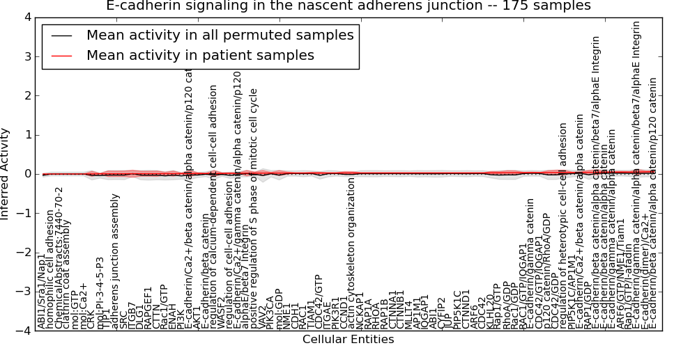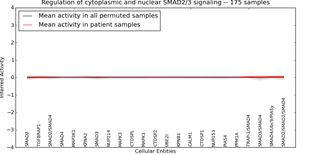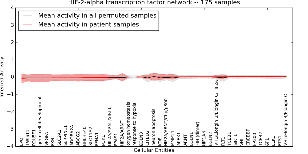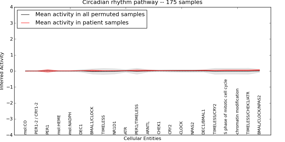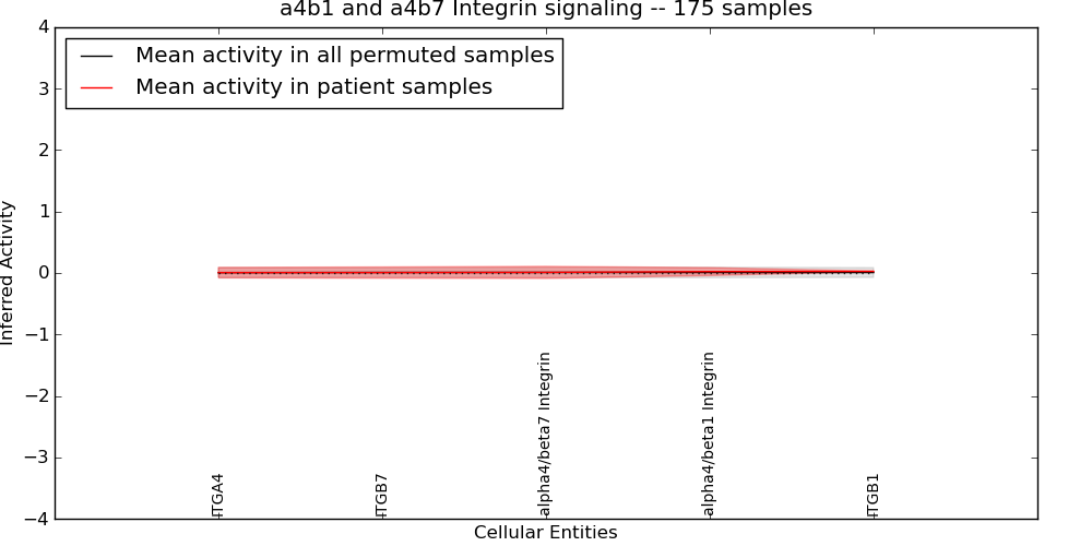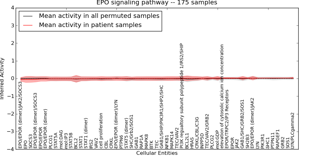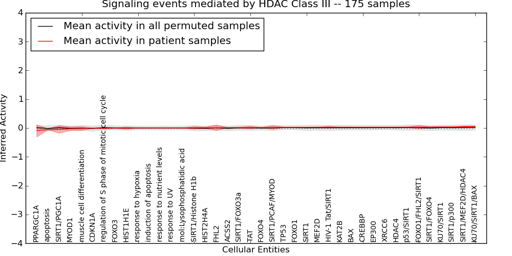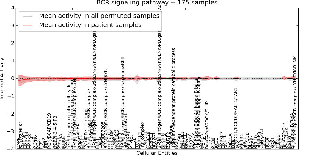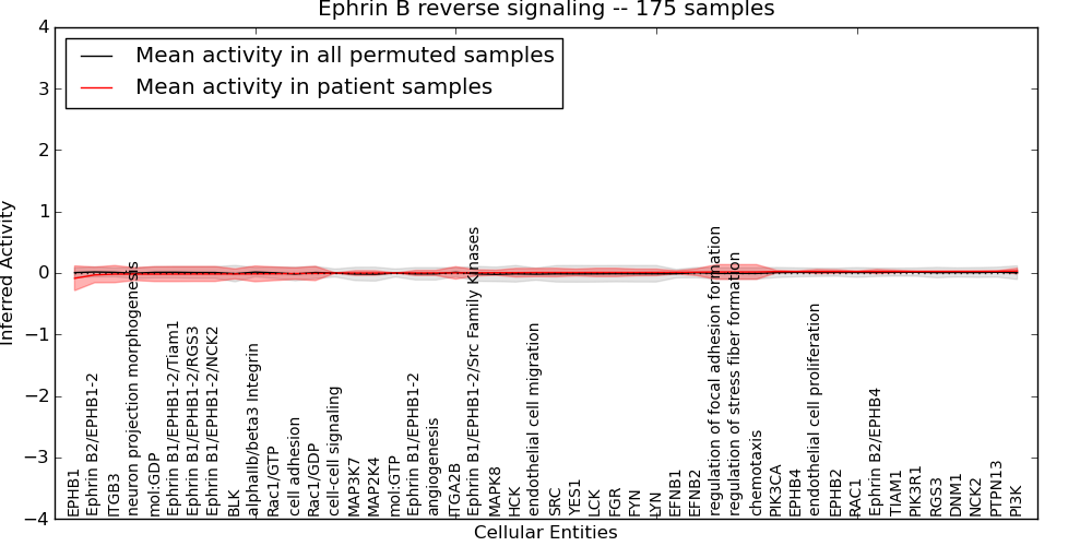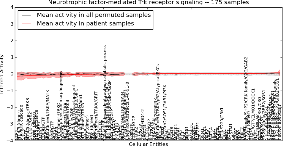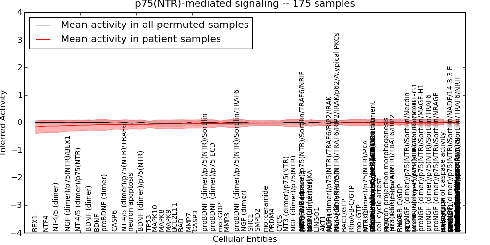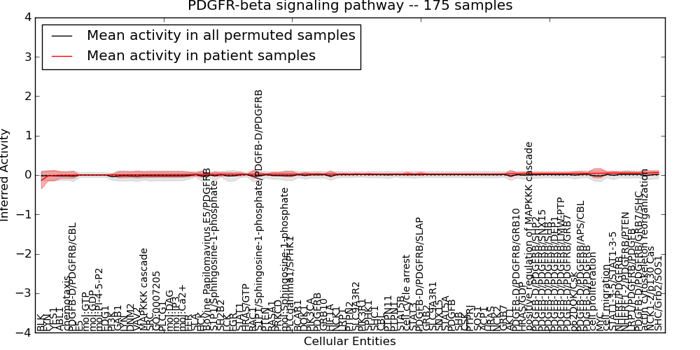 Figure S131. Get High-res Image This plot shows pathway concept perturbations across all samples against a permutation model. The concepts along the x-axis are sorted by lowest to highest mean activity for the real patient samples. Mean inferred activities are plotted along the y-axis as a colored band showing the average level and one standard deviation range. Real samples are shown in red and permuted samples in black.