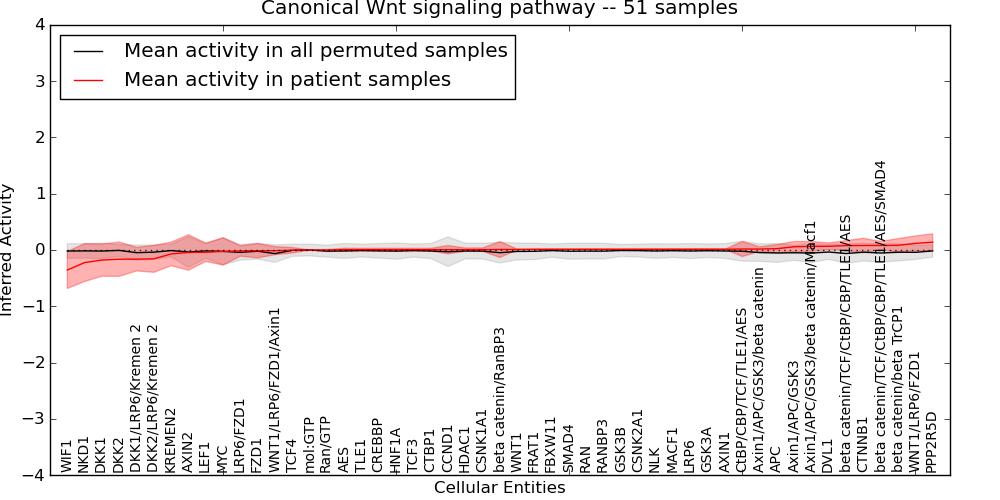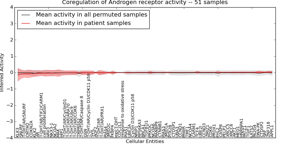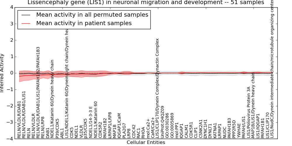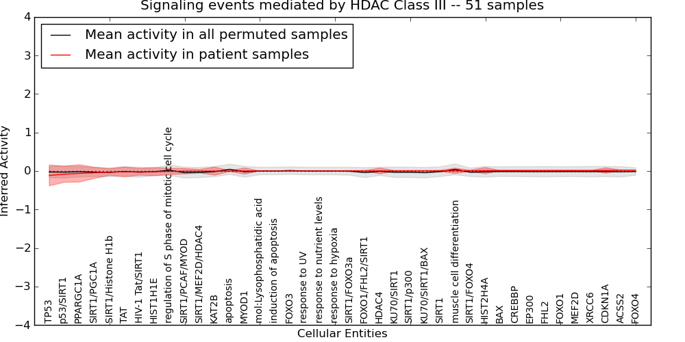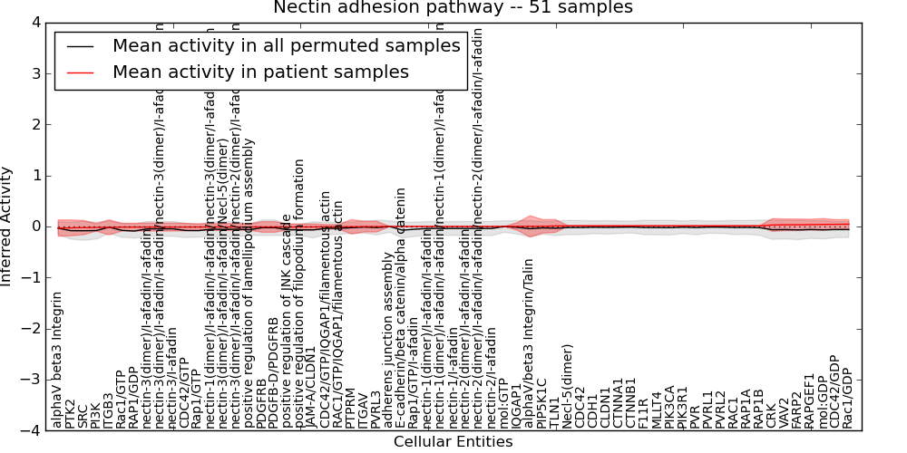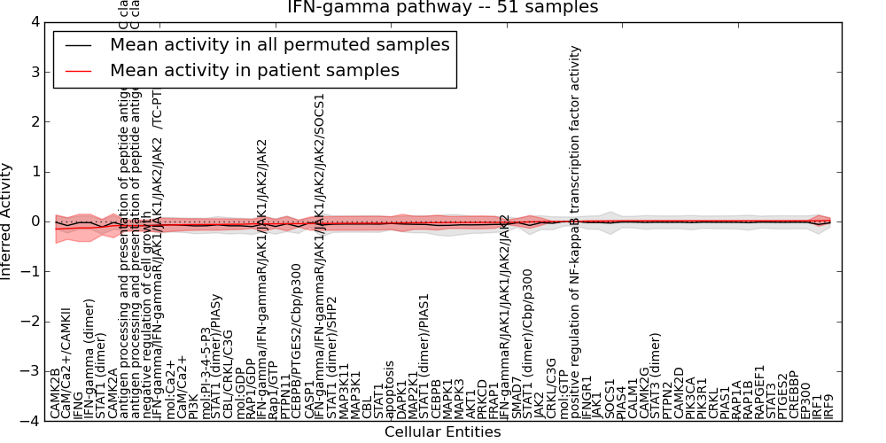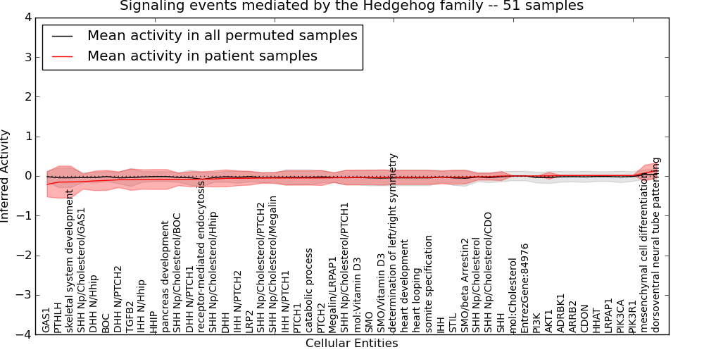 Figure S131.  Get High-res Image This plot shows pathway concept perturbations across all samples against a permutation model. The concepts along the x-axis are sorted by lowest to highest mean activity for the real patient samples. Mean inferred activities are plotted along the y-axis as a colored band showing the average level and one standard deviation range. Real samples are shown in red and permuted samples in black.