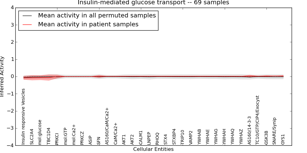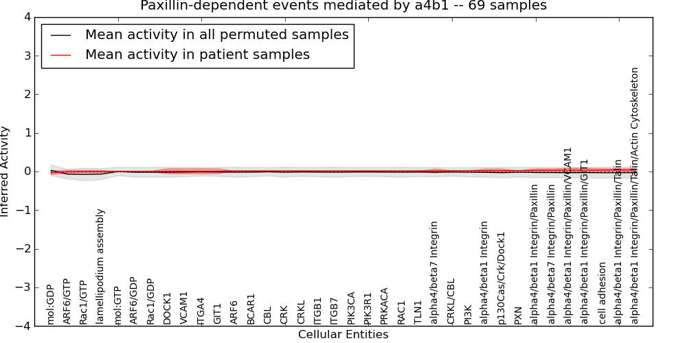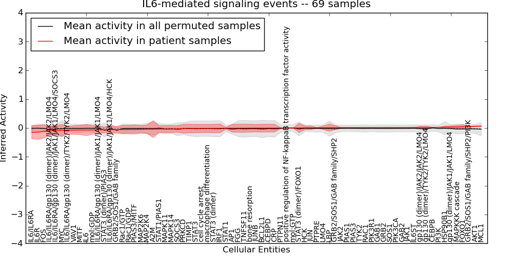 Figure S131. Get High-res Image This plot shows pathway concept perturbations across all samples against a permutation model. The concepts along the x-axis are sorted by lowest to highest mean activity for the real patient samples. Mean inferred activities are plotted along the y-axis as a colored band showing the average level and one standard deviation range. Real samples are shown in red and permuted samples in black.