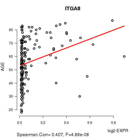 Figure S2. Get High-res Image As an example, this figure shows the association of ITGA8 to 'AGE'. P value = 4.88e-08 with Spearman correlation analysis. The straight line presents the best linear regression.