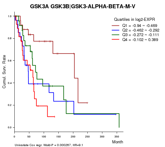 Figure S1. Get High-res Image As an example, this figure shows the association of GSK3A GSK3B|GSK3-ALPHA-BETA-M-V to 'Time to Death'. four curves present the cumulative survival rates of 4 quartile subsets of patients. P value = 0.000267 with univariate Cox regression analysis using continuous log-2 expression values.