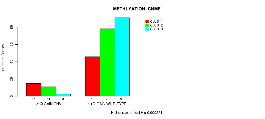 21q gain cnv correlated to 'METHLYATION_CNMF'.
