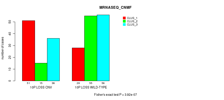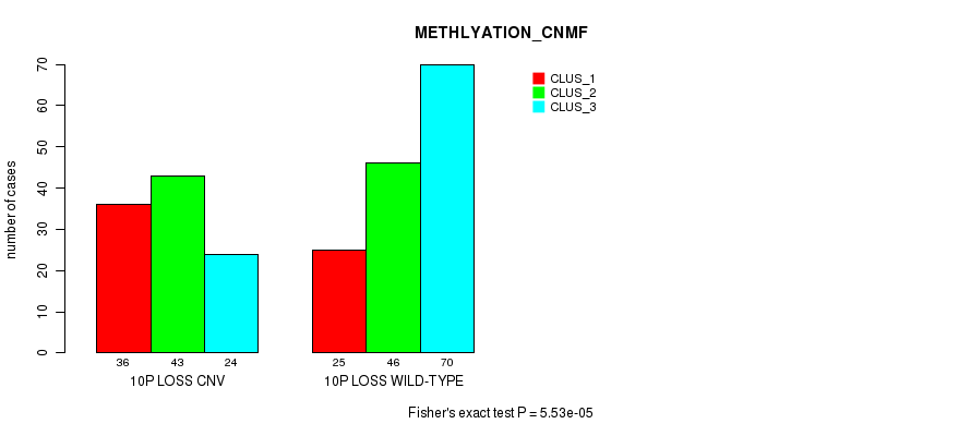 10p loss cnv correlated to 'CN_CNMF', 'METHLYATION_CNMF', and 'MRNASEQ_CNMF'.