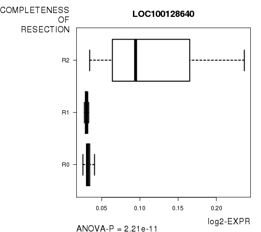 Figure S7. Get High-res Image As an example, this figure shows the association of LOC100128640 to 'COMPLETENESS.OF.RESECTION'. P value = 2.21e-11 with ANOVA analysis.