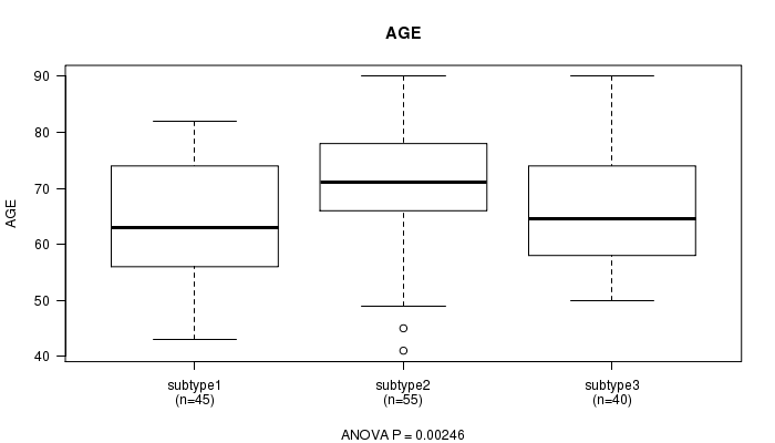 Figure S57. Get High-res Image Clustering Approach #6: 'MIRSEQ CHIERARCHICAL' versus Clinical Feature #2: 'AGE'