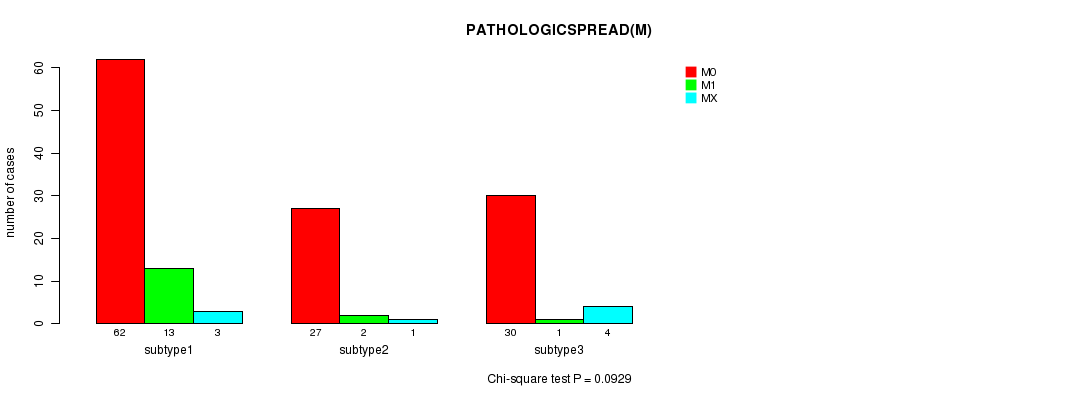 Figure S62. Get High-res Image Clustering Approach #6: 'MIRSEQ CHIERARCHICAL' versus Clinical Feature #7: 'PATHOLOGICSPREAD(M)'
