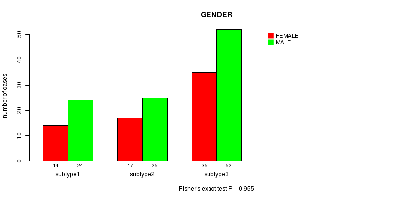 Figure S58. Get High-res Image Clustering Approach #6: 'MIRSEQ CHIERARCHICAL' versus Clinical Feature #3: 'GENDER'
