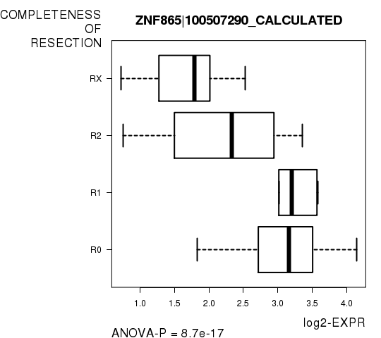 Figure S7. Get High-res Image As an example, this figure shows the association of ZNF865|100507290_CALCULATED to 'COMPLETENESS.OF.RESECTION'. P value = 8.7e-17 with ANOVA analysis.
