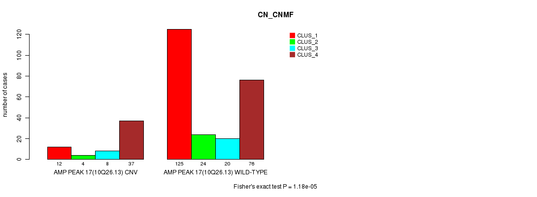 Amp Peak 17(10q26.13) cnvs correlated to 'CN_CNMF', 'METHLYATION_CNMF', and 'MRNASEQ_CNMF'.