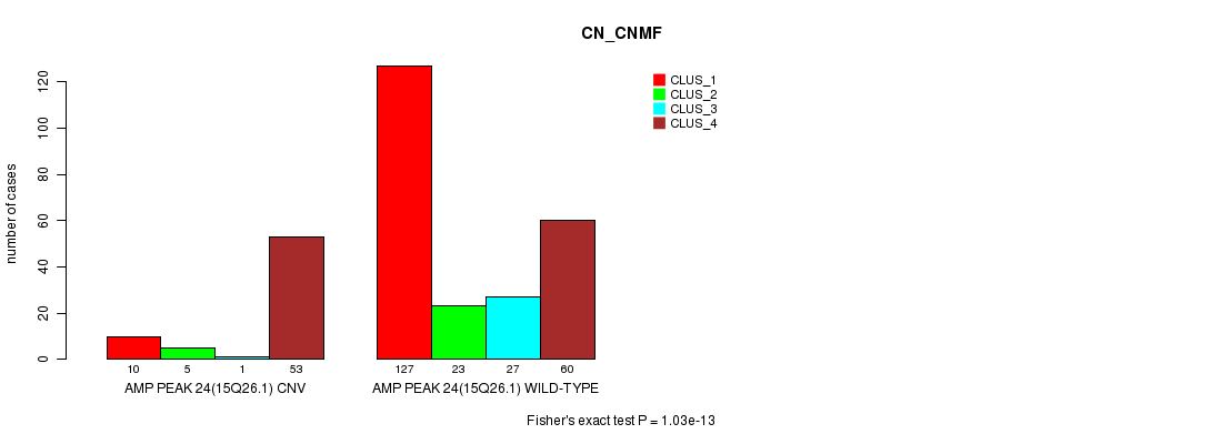 Amp Peak 24(15q26.1) cnvs correlated to 'CN_CNMF', 'METHLYATION_CNMF', 'MRNASEQ_CNMF', and 'MRNASEQ_CHIERARCHICAL'.