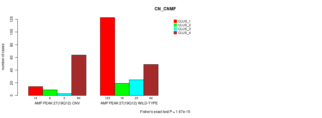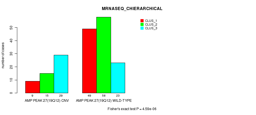 Amp Peak 27(19q12) cnvs correlated to 'CN_CNMF', 'METHLYATION_CNMF', 'MRNASEQ_CNMF', 'MRNASEQ_CHIERARCHICAL', 'MIRSEQ_CNMF', and 'MIRSEQ_CHIERARCHICAL'.