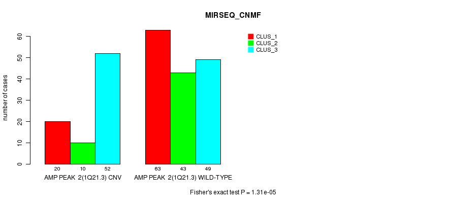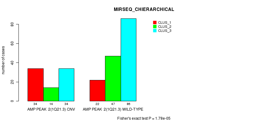 Amp Peak 2(1q21.3) cnvs correlated to 'CN_CNMF', 'METHLYATION_CNMF', 'MRNASEQ_CNMF', 'MRNASEQ_CHIERARCHICAL', 'MIRSEQ_CNMF', and 'MIRSEQ_CHIERARCHICAL'.