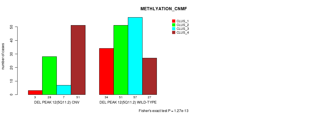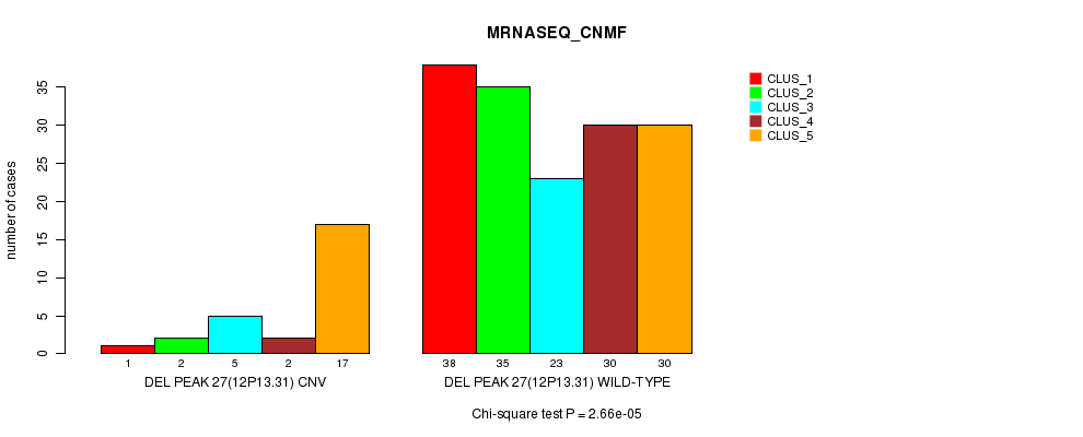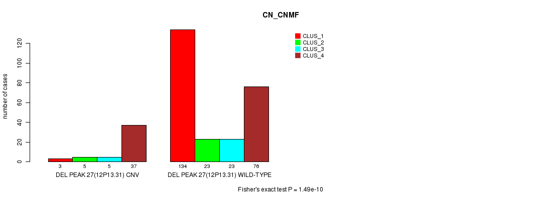 Del Peak 27(12p13.31) cnvs correlated to 'CN_CNMF', 'METHLYATION_CNMF', 'MRNASEQ_CNMF', and 'MRNASEQ_CHIERARCHICAL'.