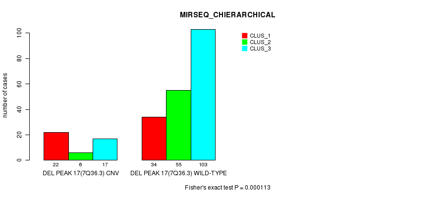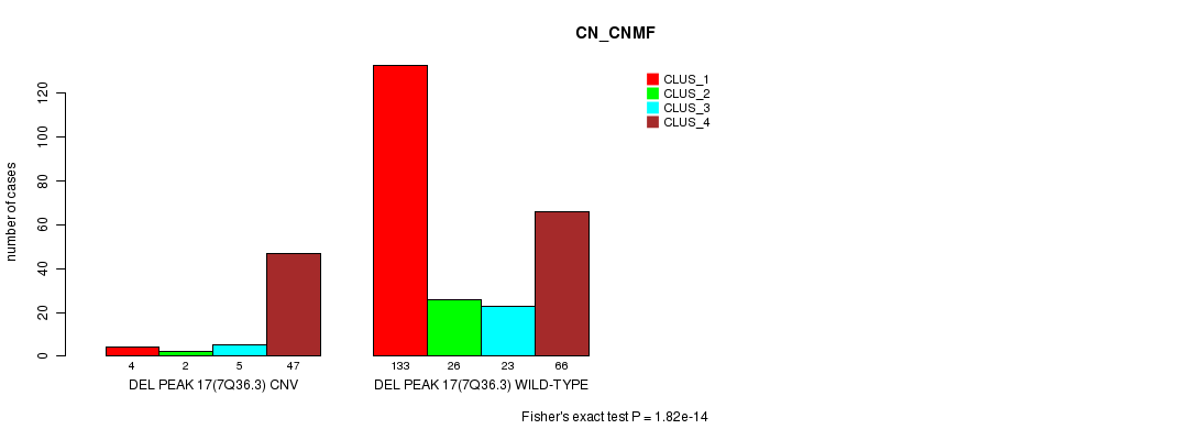 Del Peak 17(7q36.3) cnvs correlated to 'CN_CNMF', 'METHLYATION_CNMF', 'MRNASEQ_CNMF', and 'MIRSEQ_CHIERARCHICAL'.