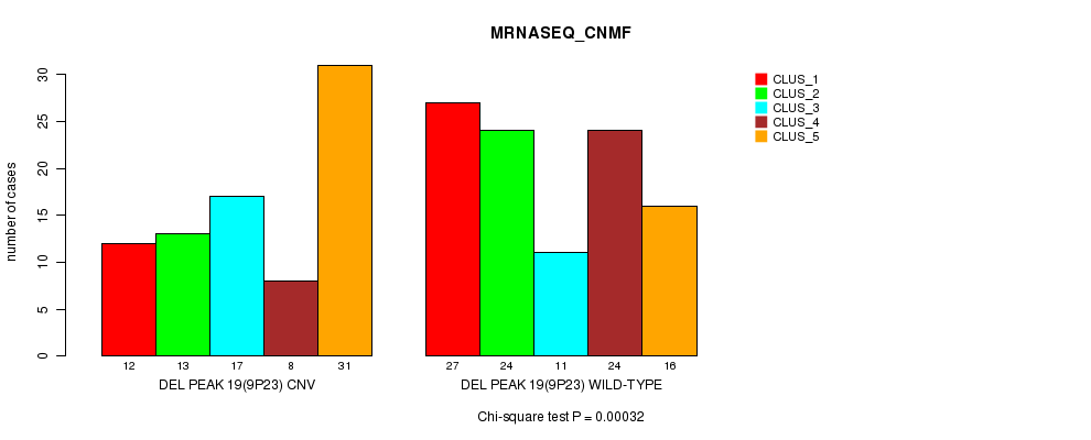 Del Peak 19(9p23) cnvs correlated to 'CN_CNMF', 'METHLYATION_CNMF', and 'MRNASEQ_CNMF'.