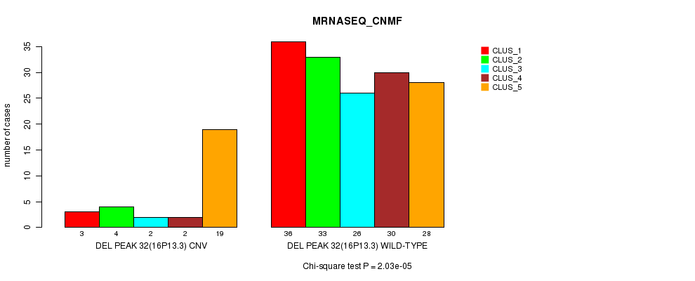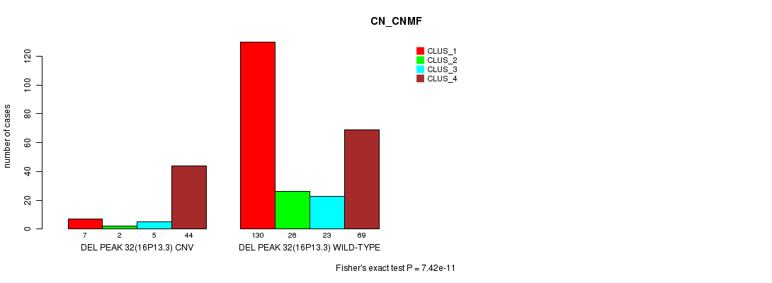 Del Peak 32(16p13.3) cnvs correlated to 'CN_CNMF', 'METHLYATION_CNMF', 'MRNASEQ_CNMF', and 'MRNASEQ_CHIERARCHICAL'.