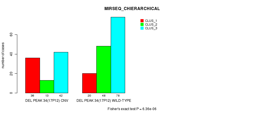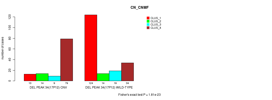 Del Peak 34(17p12) cnvs correlated to 'CN_CNMF', 'METHLYATION_CNMF', 'MRNASEQ_CNMF', 'MRNASEQ_CHIERARCHICAL', and 'MIRSEQ_CHIERARCHICAL'.