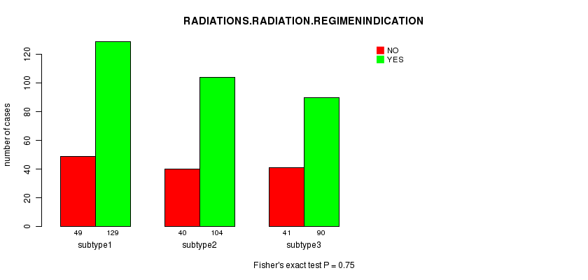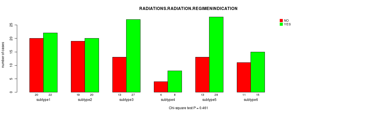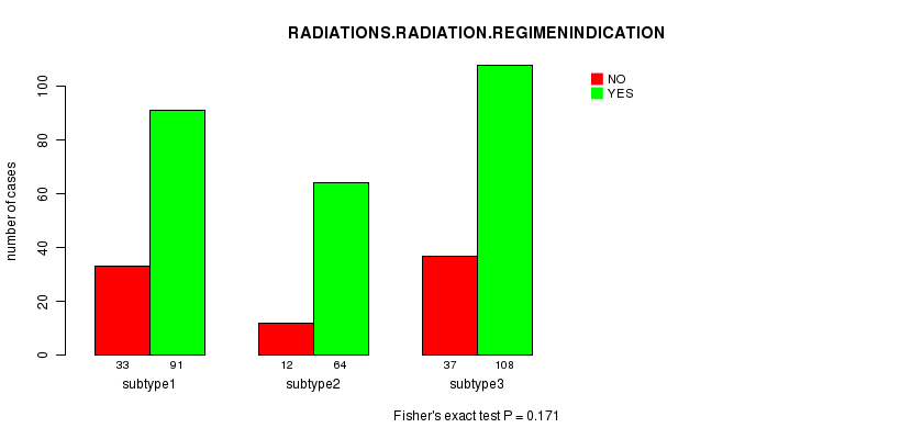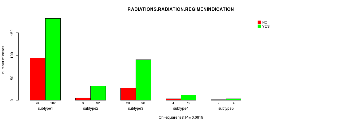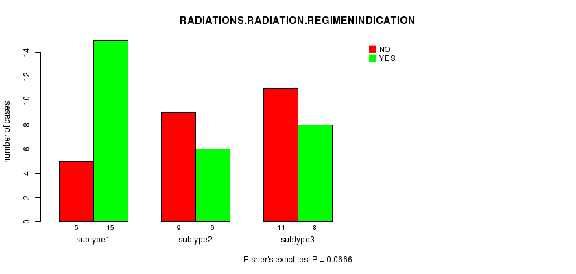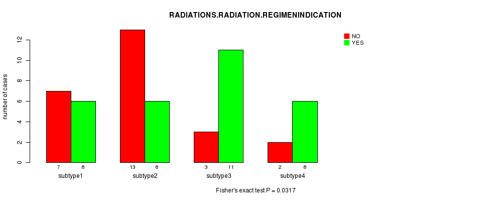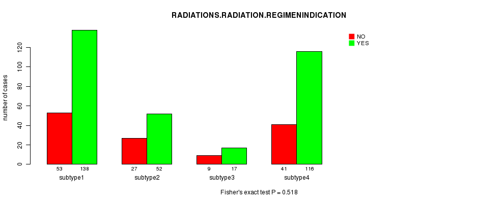 Figure S39. Get High-res Image Clustering Approach #8: 'RNAseq cHierClus subtypes' versus Clinical Feature #4: 'RADIATIONS.RADIATION.REGIMENINDICATION'
