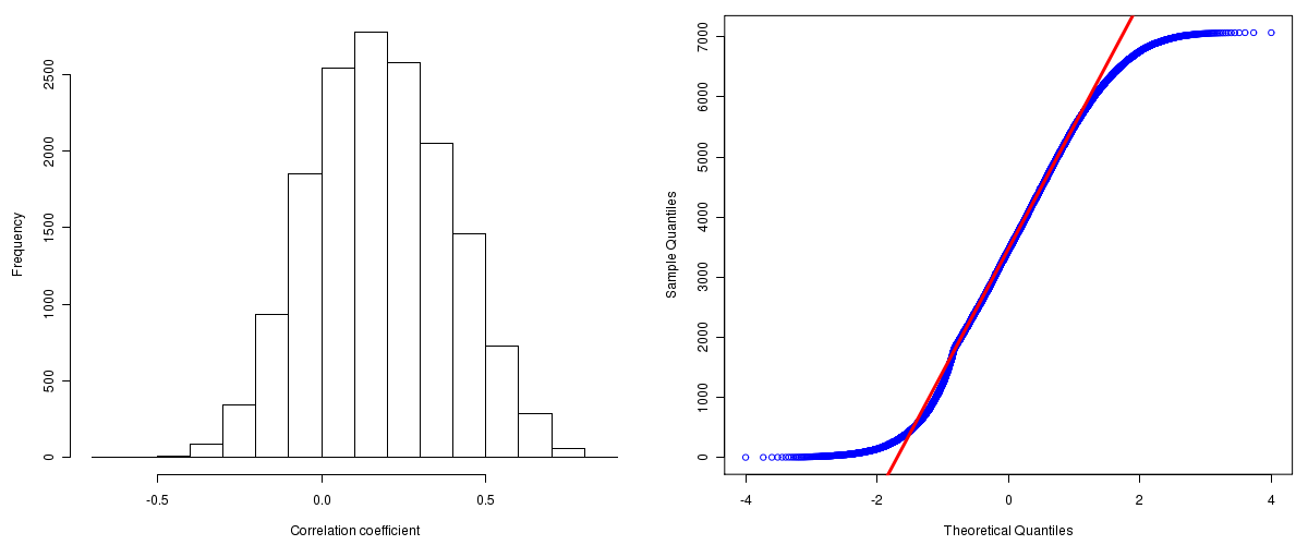 Figure 1. Summary figures. Left: histogram showing the distribution of the calculated correlations across samples for all Genes. Right: QQ plot of the calculated correlations across samples. The QQ plot is used to plot the quantiles of the calculated correlation coefficients against that derived from a normal distribution. Points deviating from the blue line indicate deviation from normality.